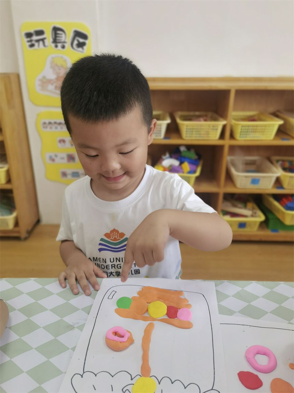 小朋友们还运用自己的巧手做出美丽的糖果罐分享给自己的好朋友。瞧他们有的运用彩笔将自己喜欢的糖果绘画出来;有的运用七彩的超轻粘土捏制出好看的糖果形状;还有的在美术区找到了彩色的小绒球,珠光亮片,玉米粒等等装饰品进行黏贴作画。
