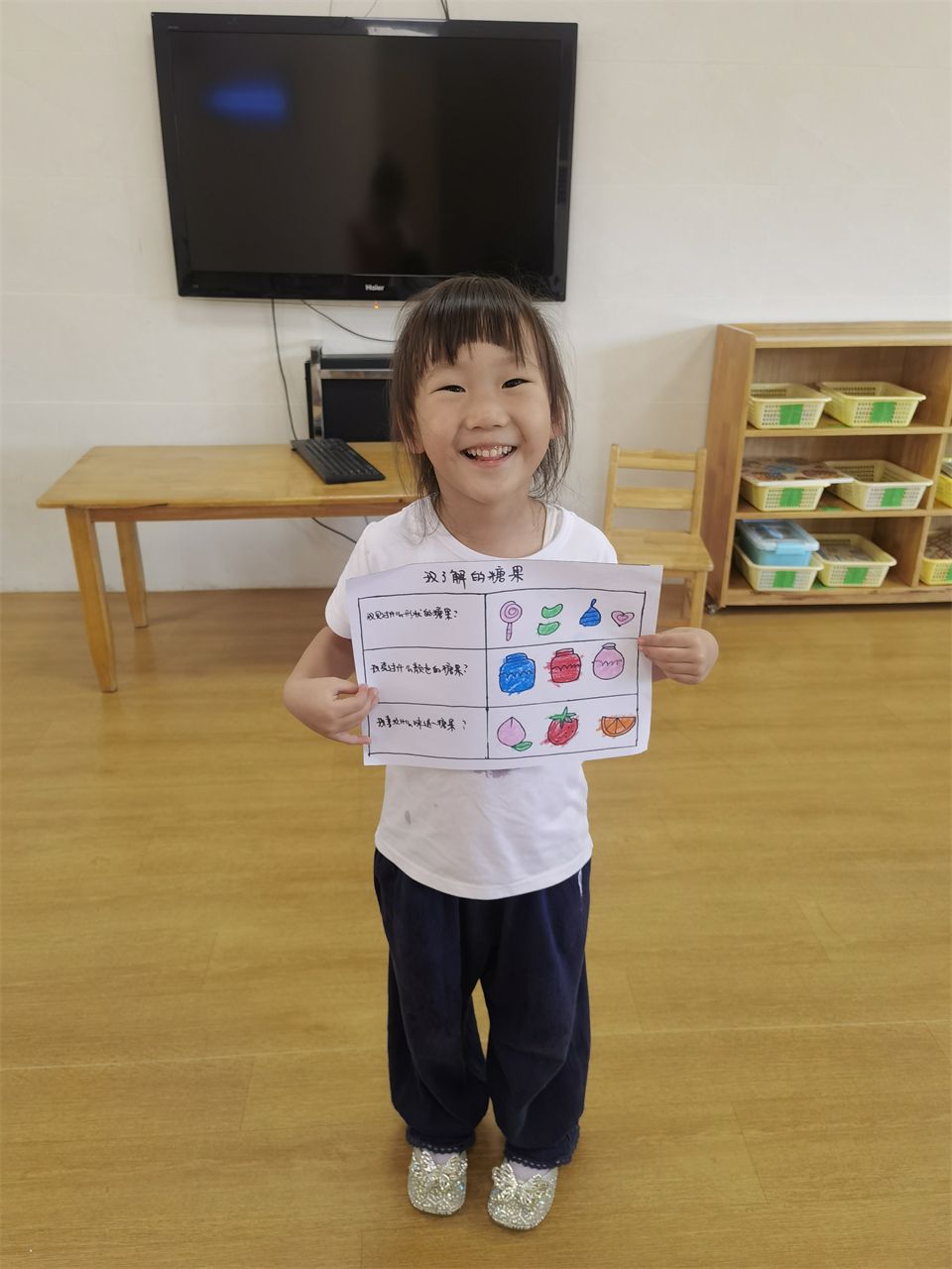 “糖果有哪些有不同的颜色?有哪些形状?哪些味道?”带着孩子对橘子的疑问我们设计了一张调查表,小朋友们和爸爸妈妈一起寻找糖果的秘密,并和班级的小伙伴们分享。