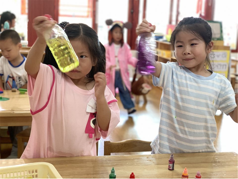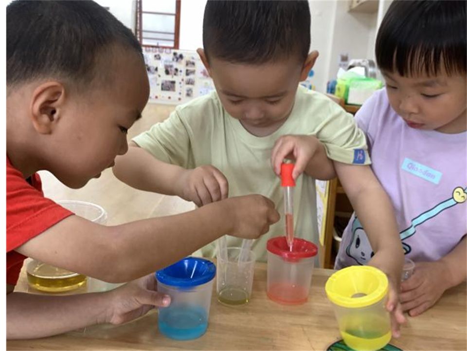 热烈的红,平静的蓝,灿烂的黄,它们是多彩世界的三原色。如果它们相遇交织,能绘就出什么样的奇迹呢?宝贝们兴奋无比,人人争当“颜”究员,动手操作实验并认真观察,不断地去感知和体验。
