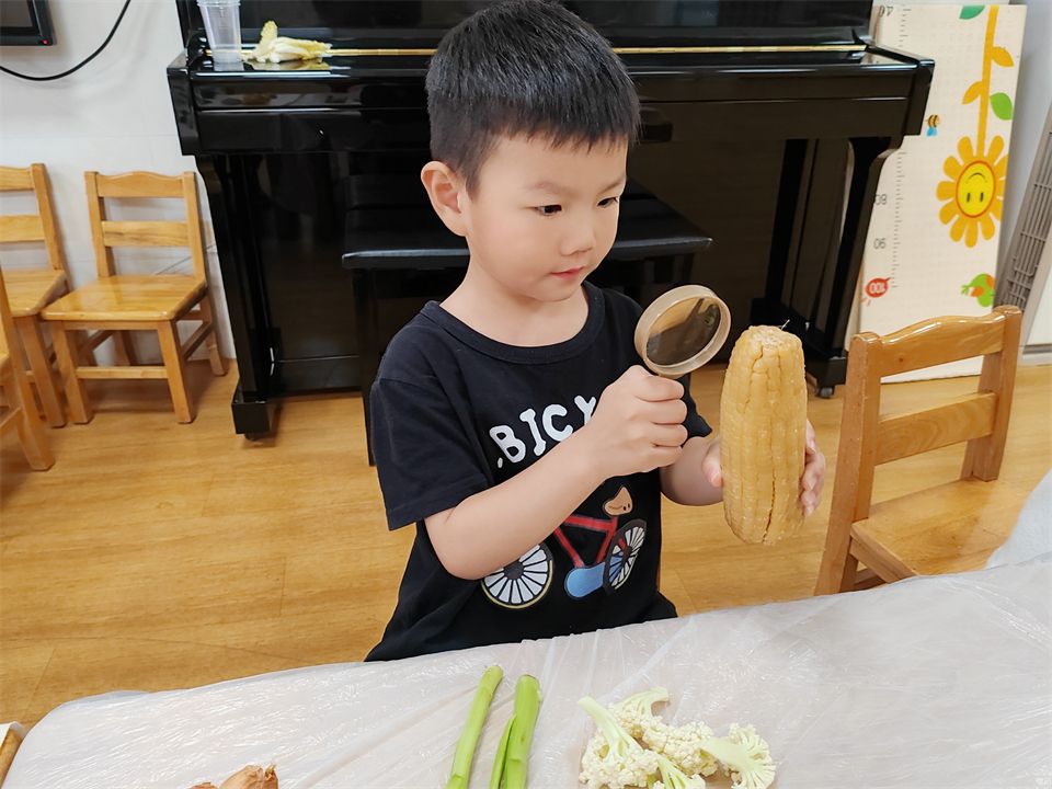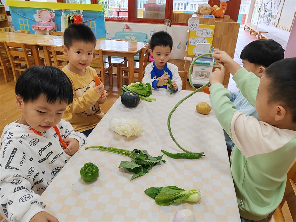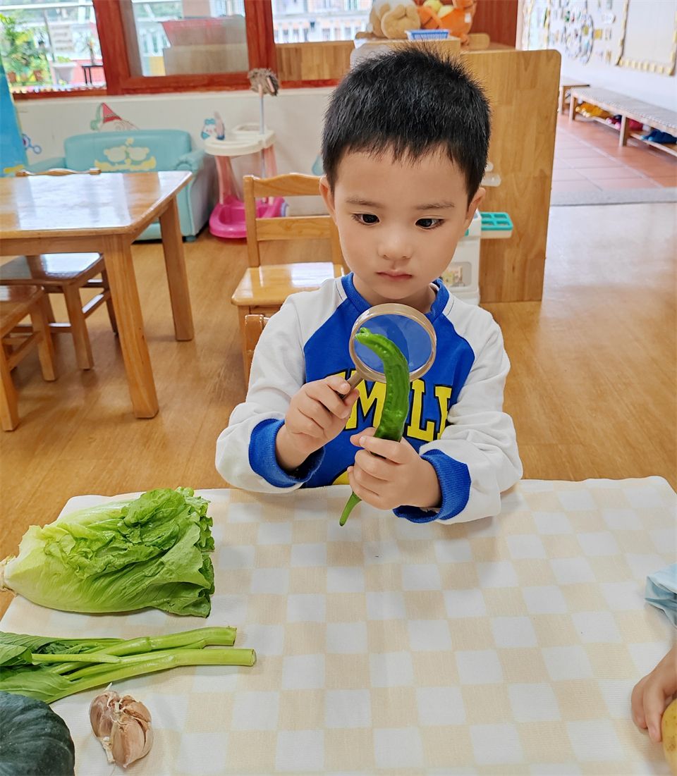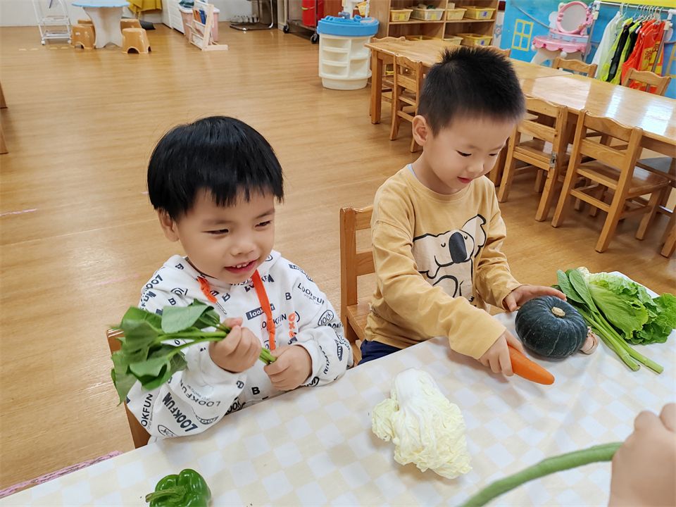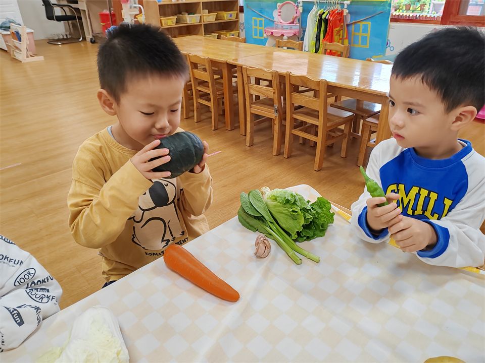 为了宝贝们更加直观的认识蔬菜,每个宝贝都带来了一颗蔬菜,并用摸一摸,看一看,闻一闻的方式了解各种蔬菜。