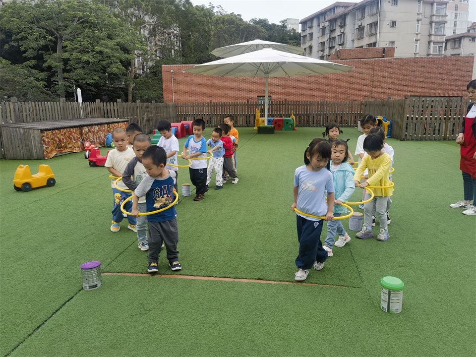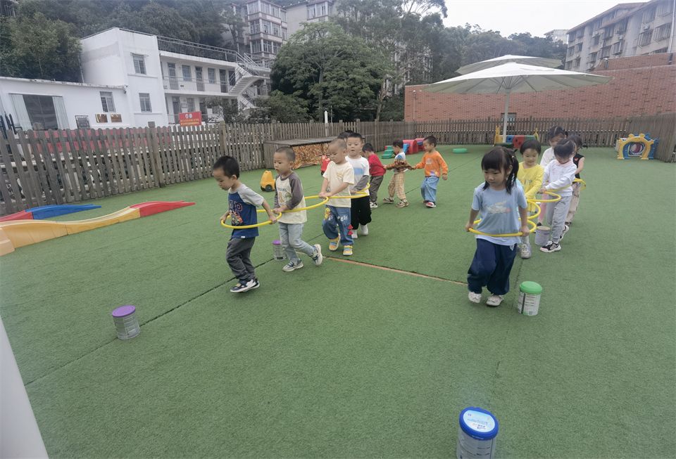 一起用呼啦圈连起的小火车,小火车跑的真快呀!