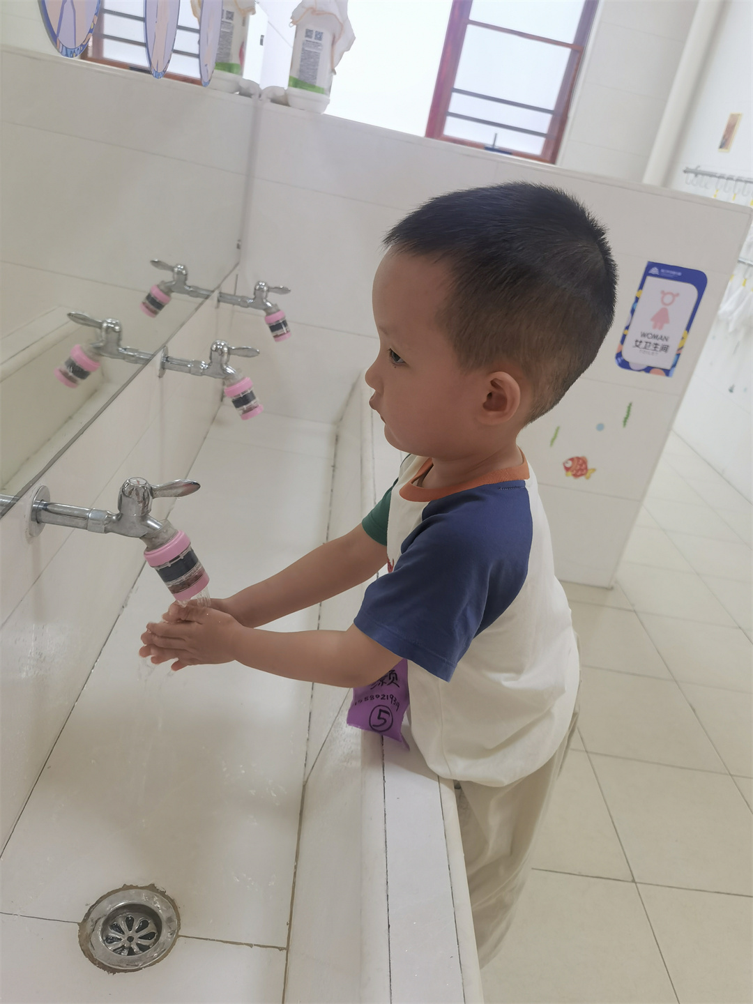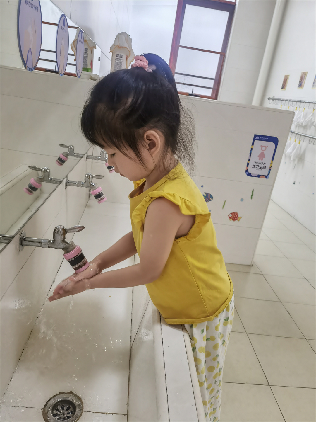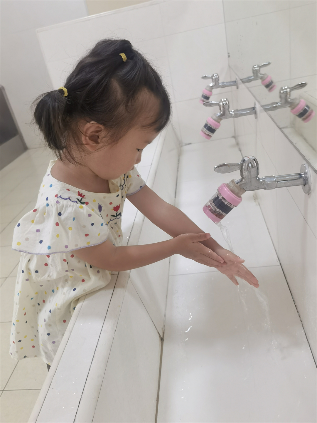 吃完美味的饭菜和点心前一定要洗手的,老师看看我棒不棒,水龙头都是我自己开的。