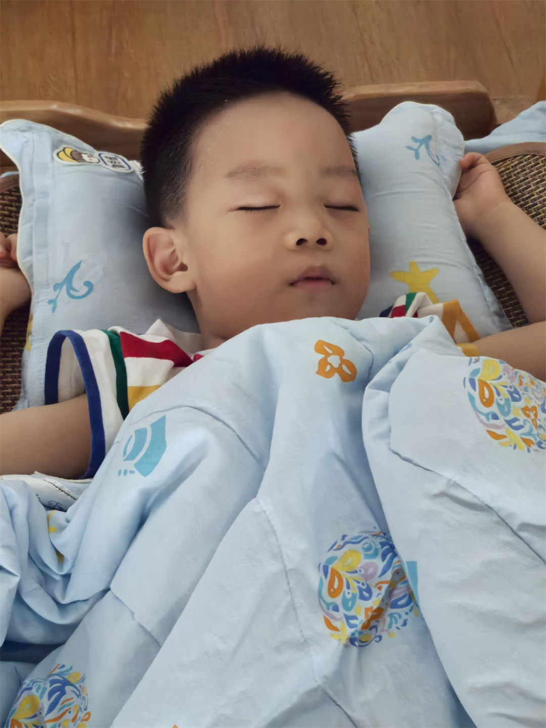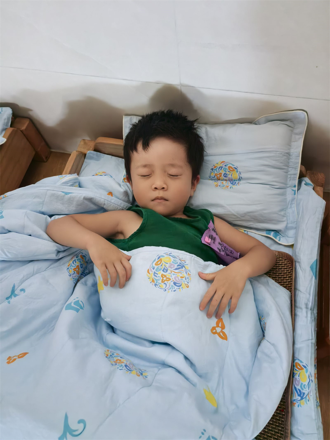 午睡时间到了。小朋友们呼吸均匀,脸蛋红扑扑。有的小嘴微张,有的抓着被角。他们沉浸梦乡,睡相可爱极了。