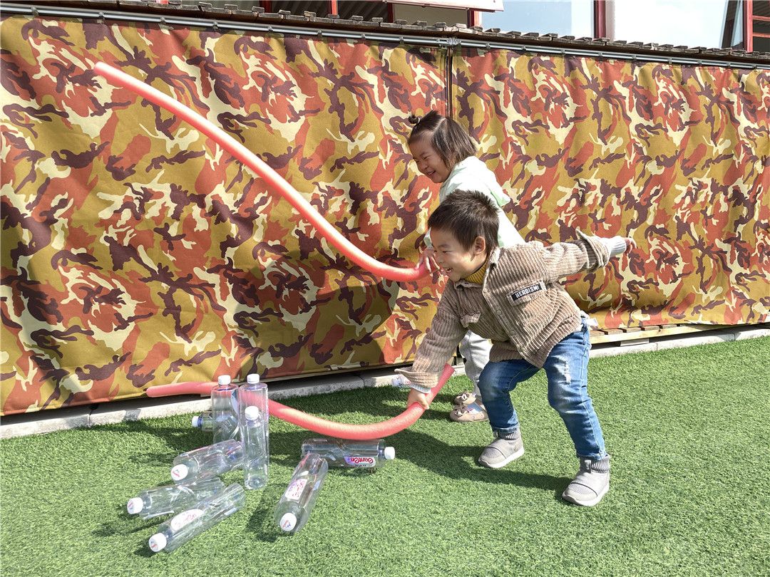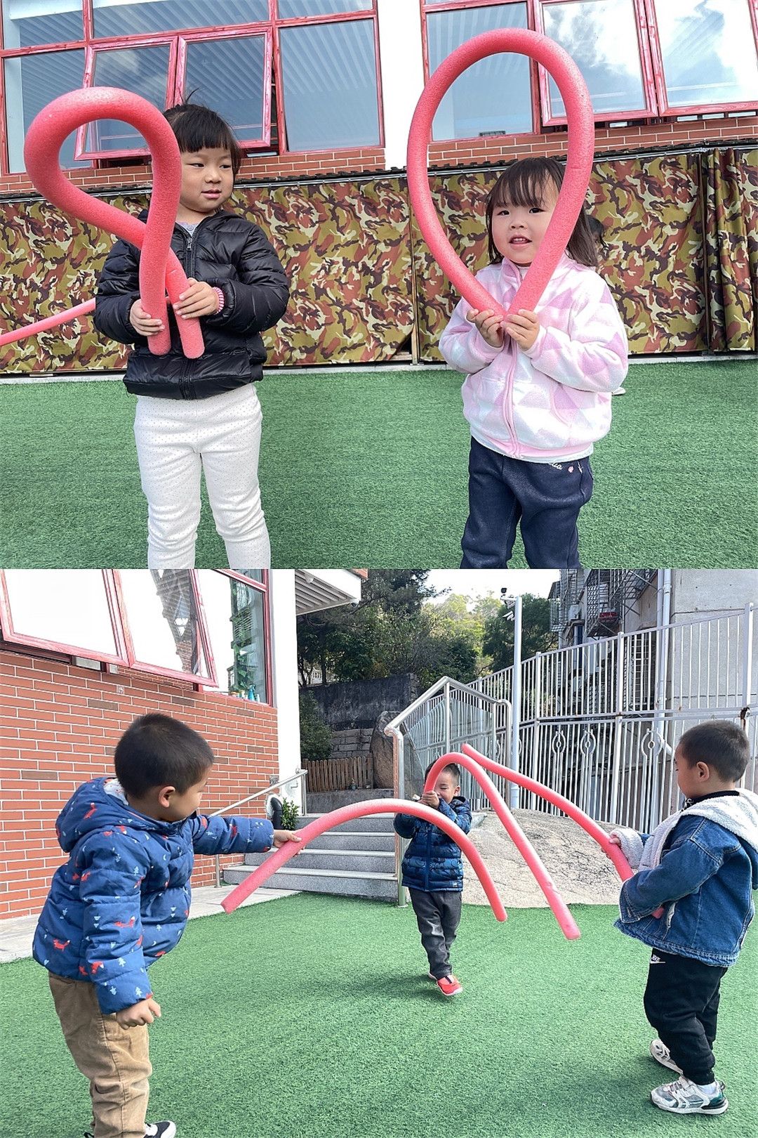 有时,宝贝们会搬来了垫子,把海绵棒立在垫子旁边当隧道;有时,宝贝们会拿海绵棒“打怪兽”;有时,宝贝们会和小伙伴比赛“赶小球”......