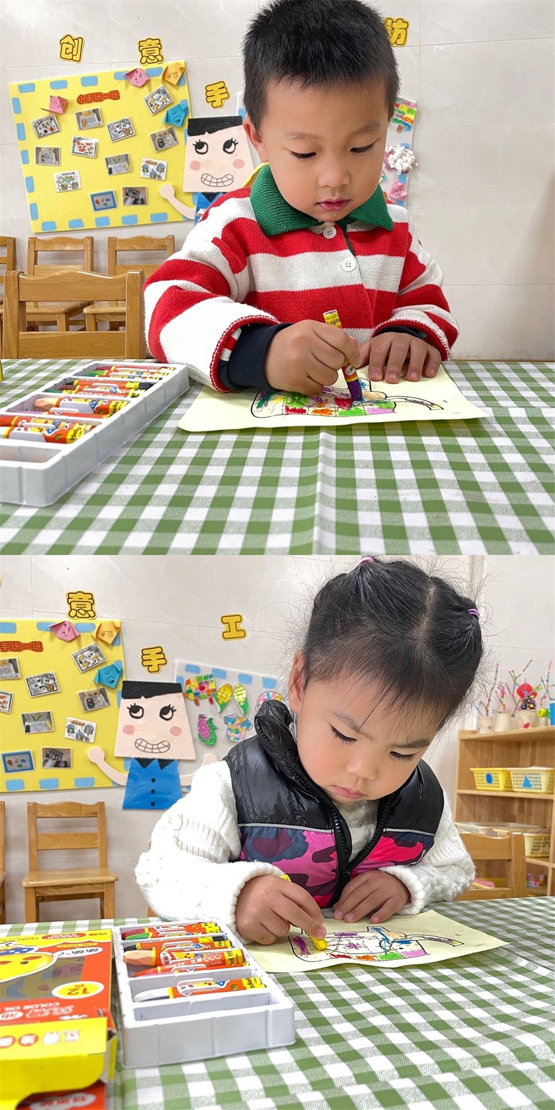 “我用彩色的蜡笔,给大象穿上漂亮的衣服。”