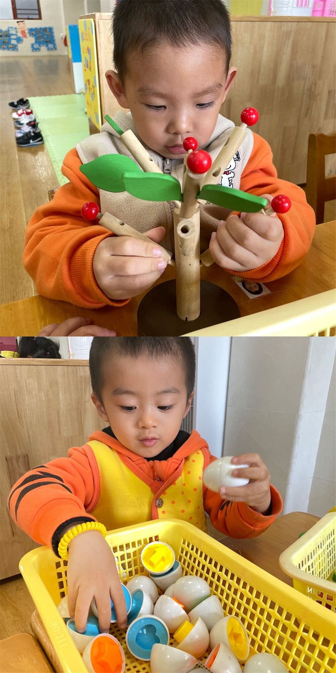 爸爸妈妈,班级里还有很多其他好玩的游戏和玩具。我们有时候会搭积木、拼甜甜圈;有时候会和好朋友一起分享玩具;有时候会自己安静地玩聪明蛋、拼水果树等等。
