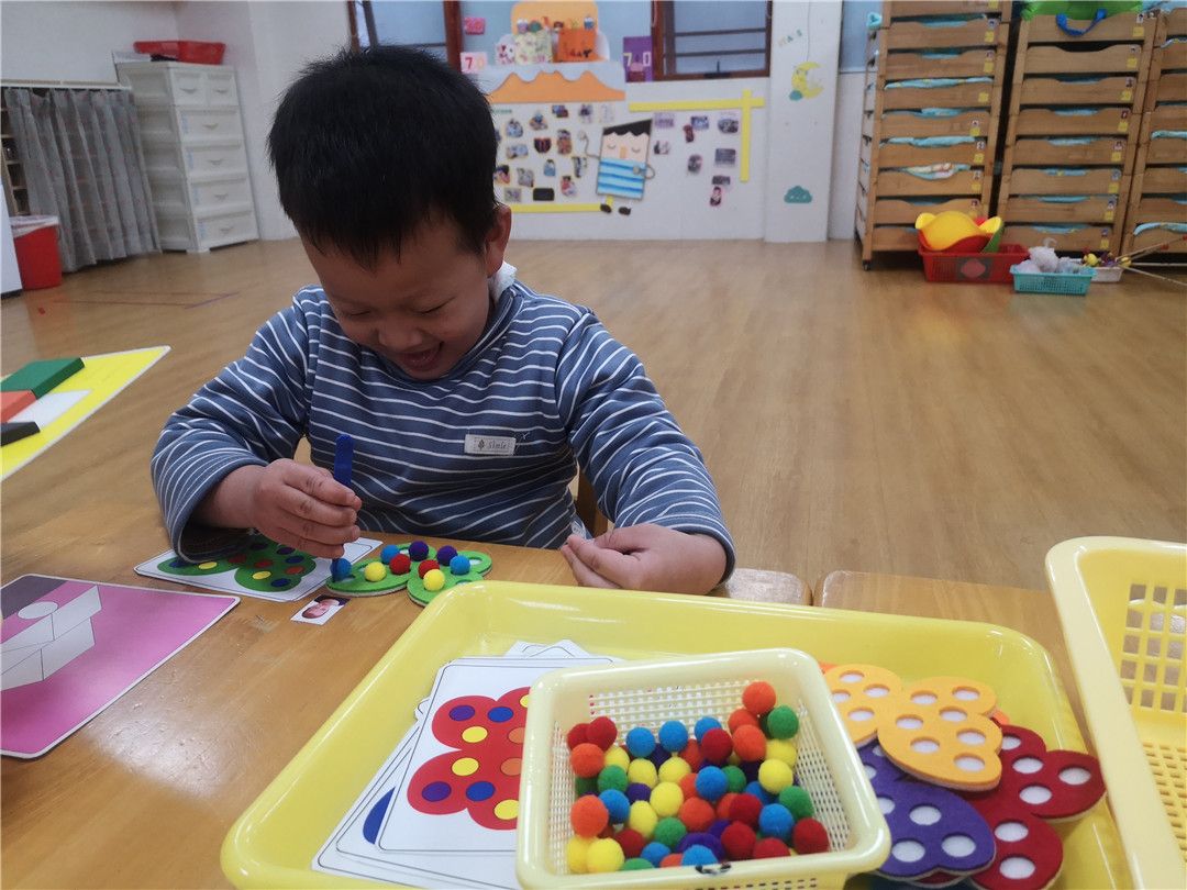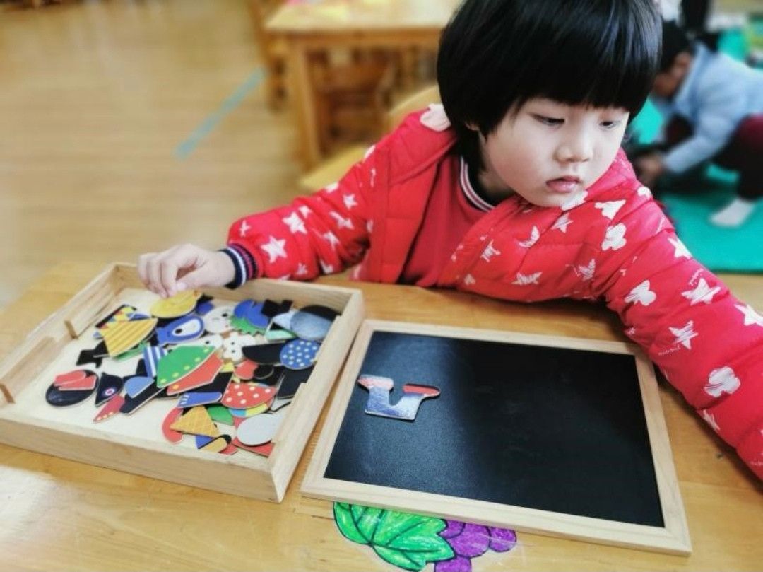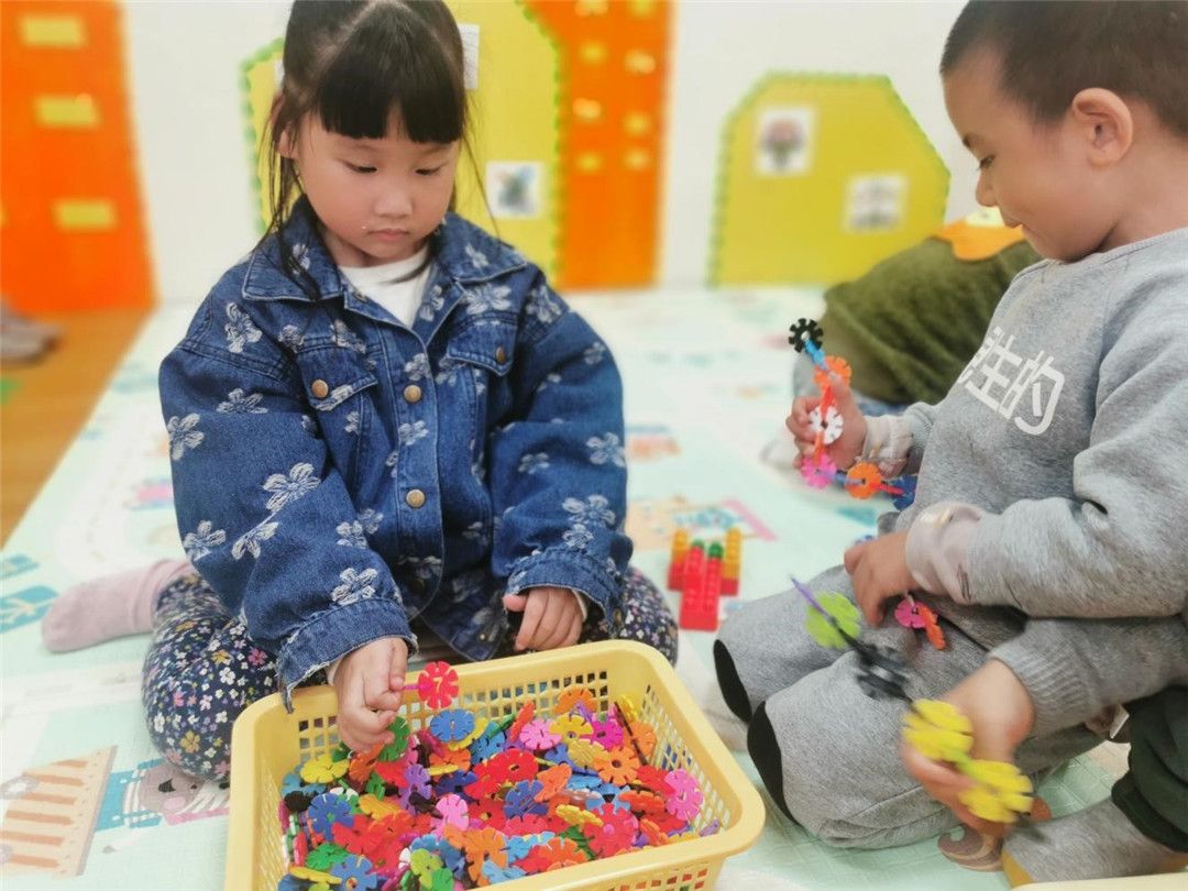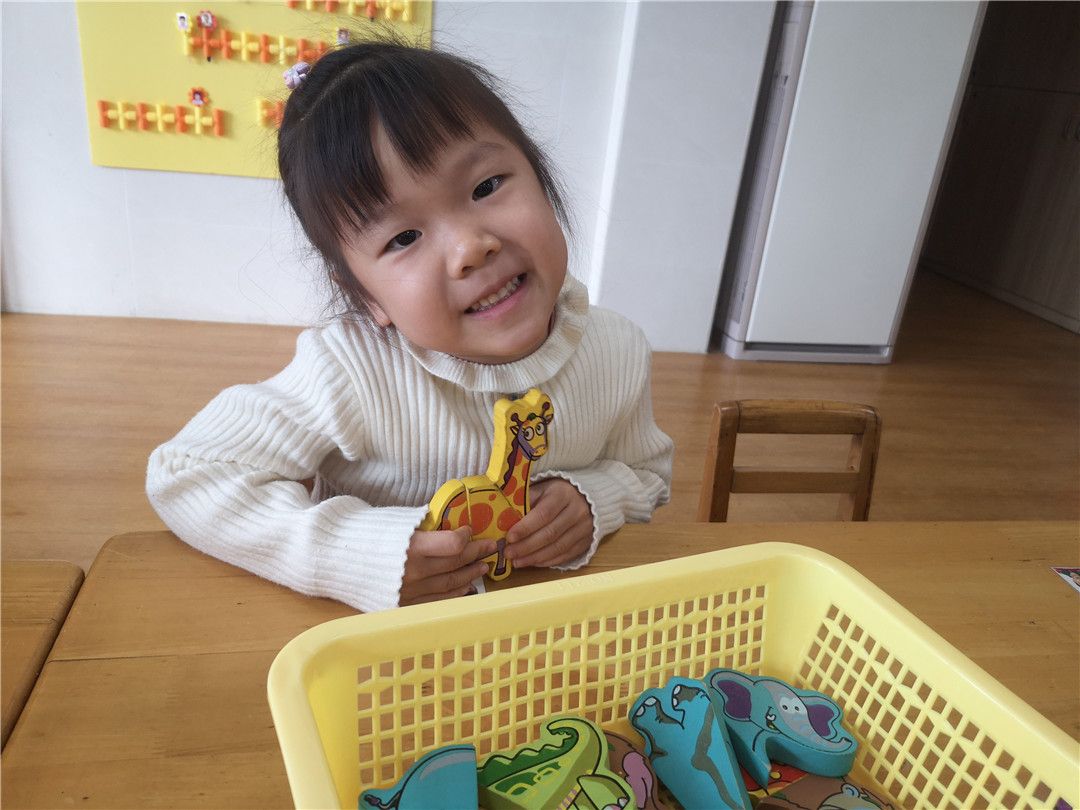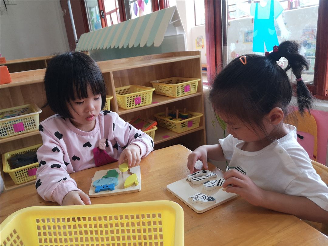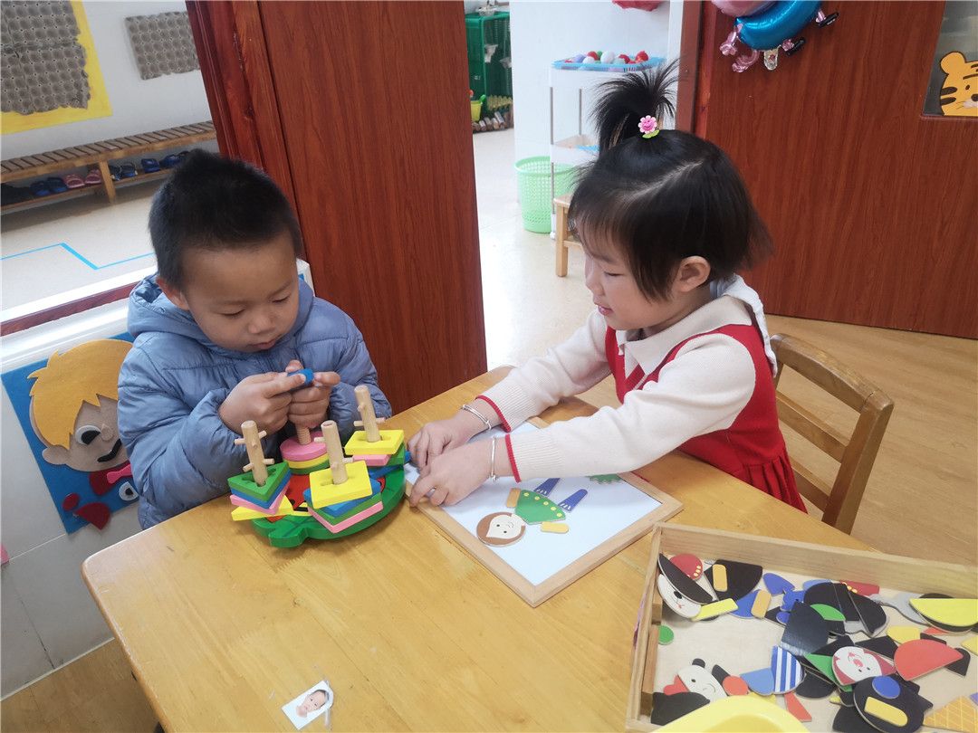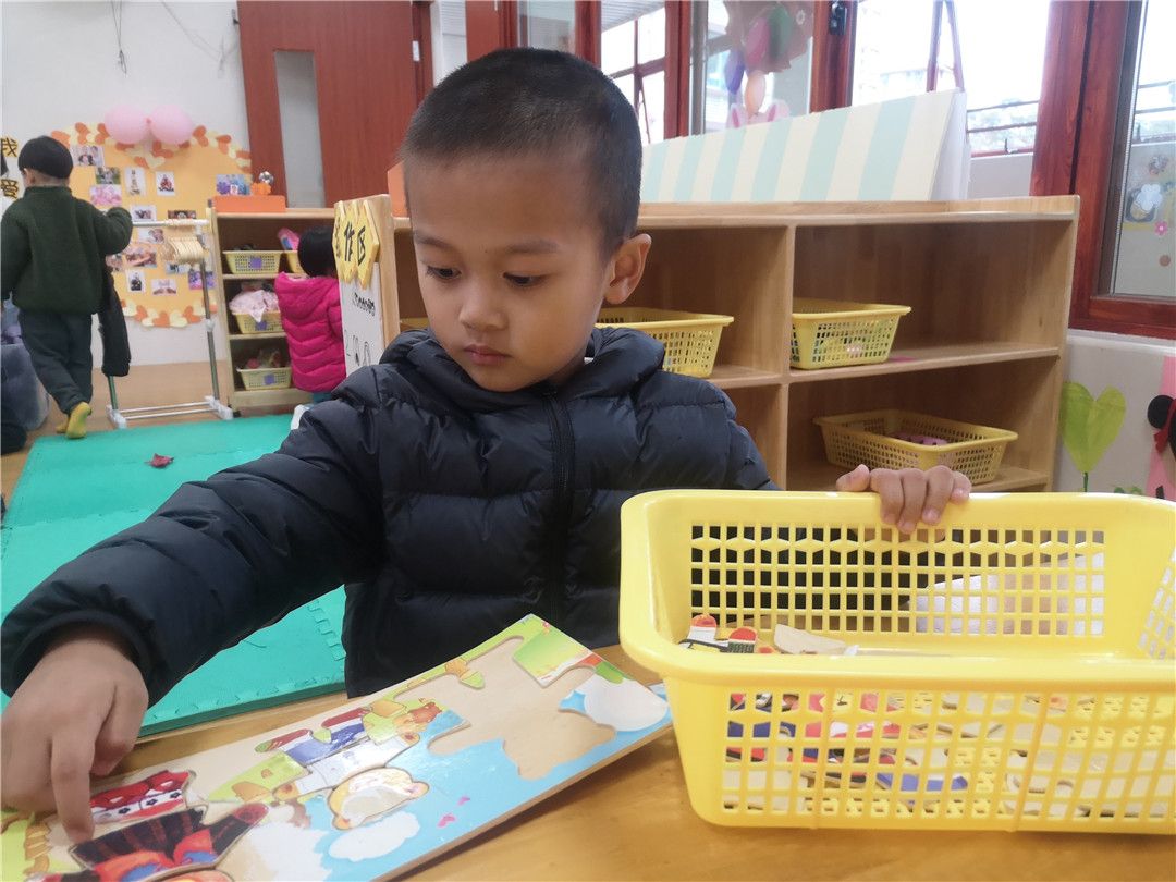 操作区中的孩子们正在专注地动手操作着,大家可别小看了这个拼块,它可是很难的哦!快来看看我们的小朋友们,到底能不能成功地把它拼出来。