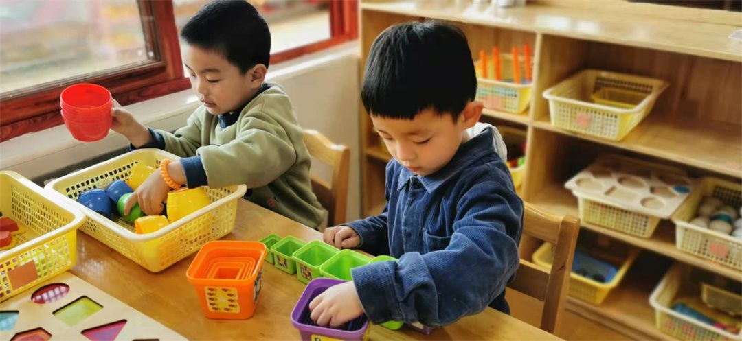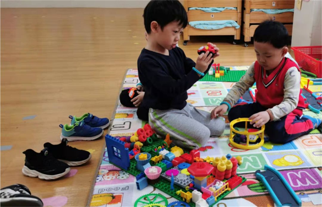 萌宝和小伙伴一起给小汽车搭建停车场。