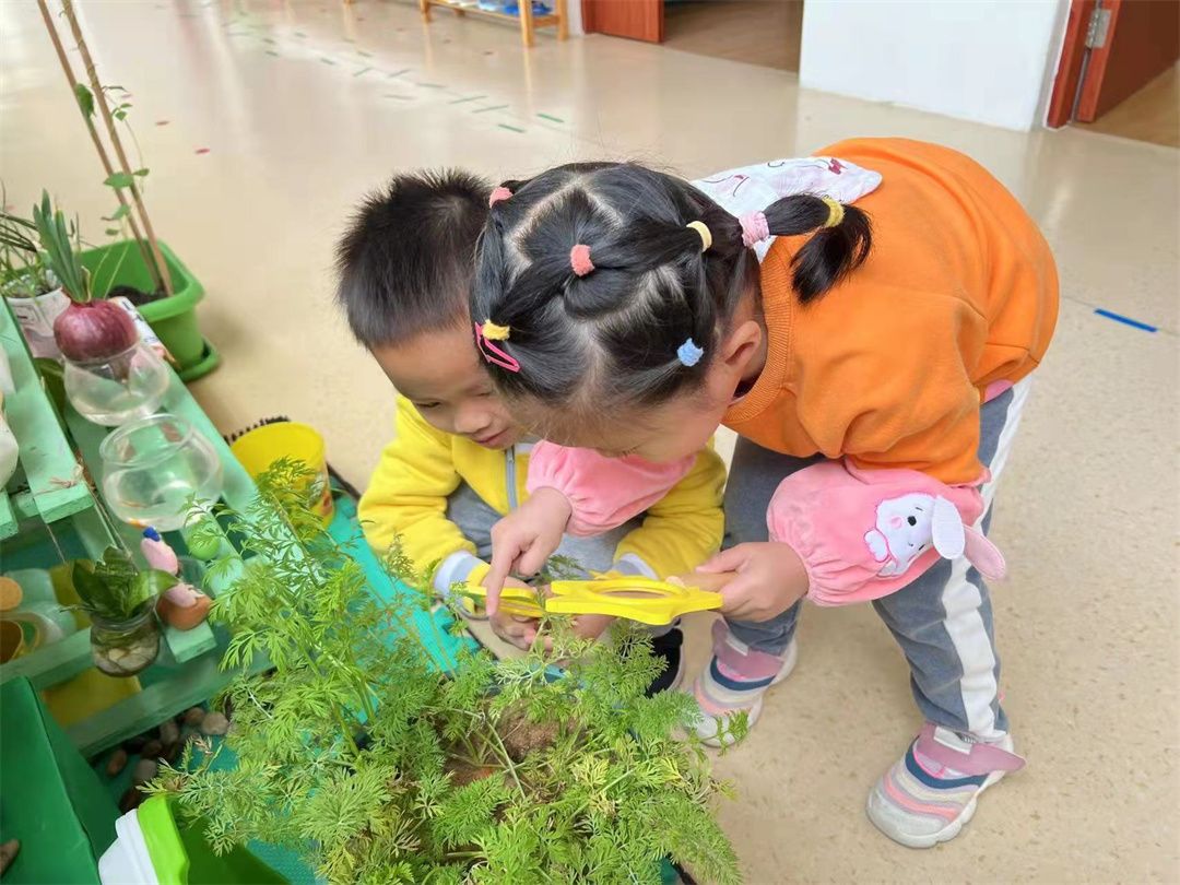 拿着放大镜瞧一瞧萝卜叶子长高了吗?