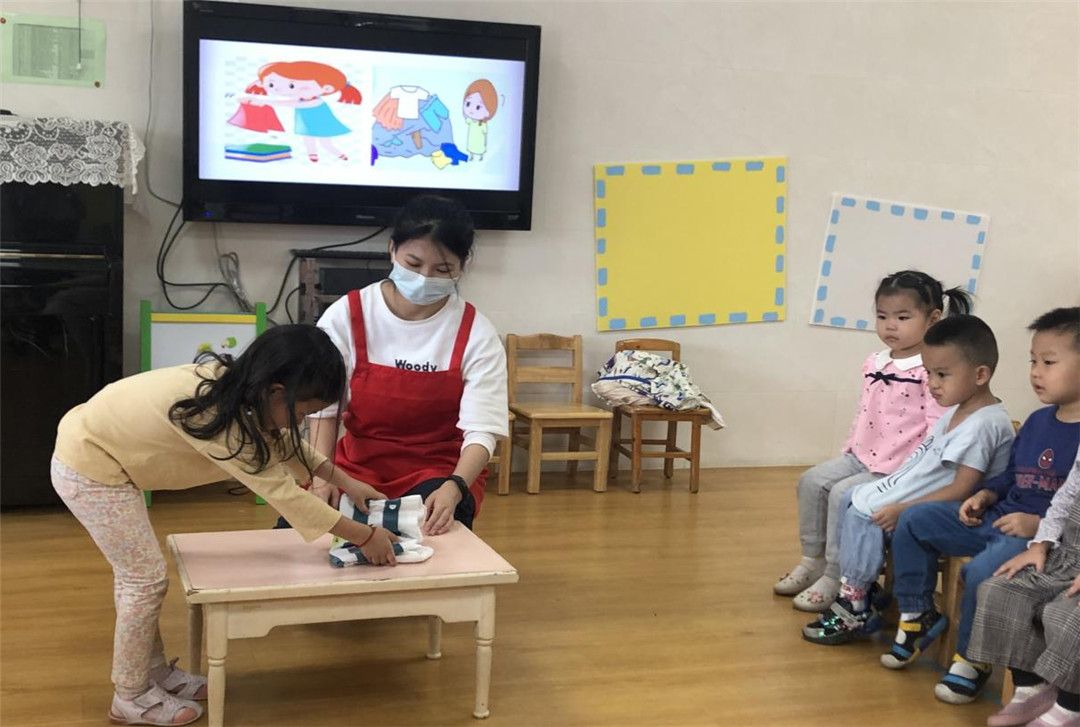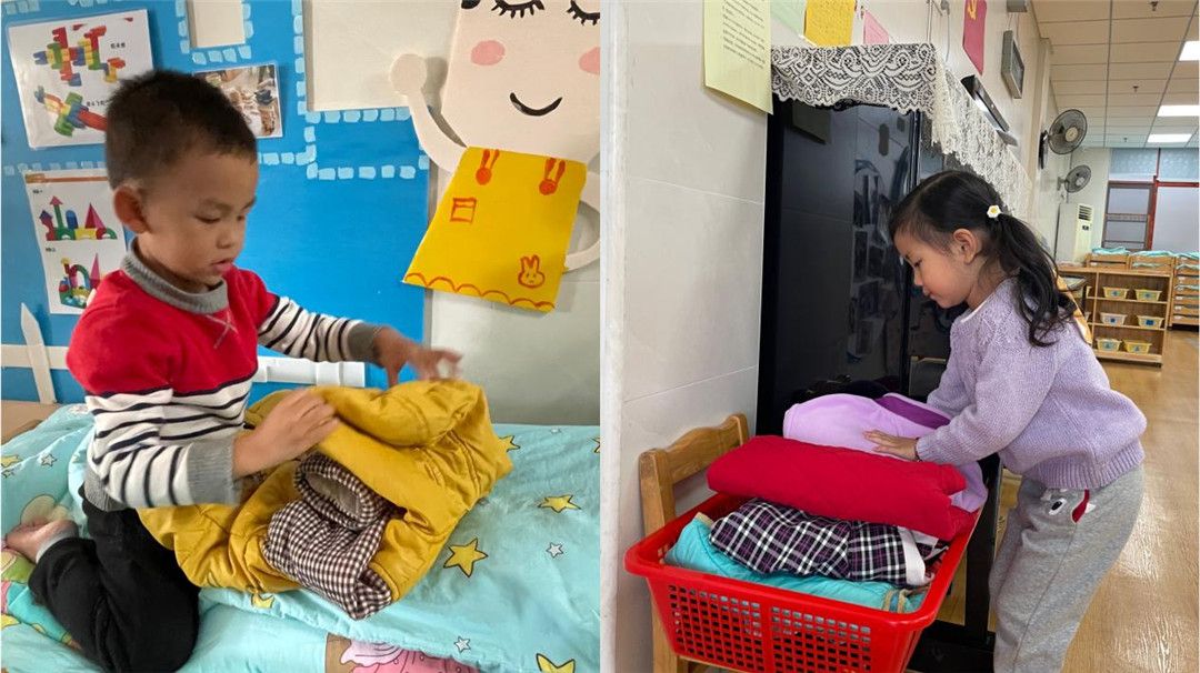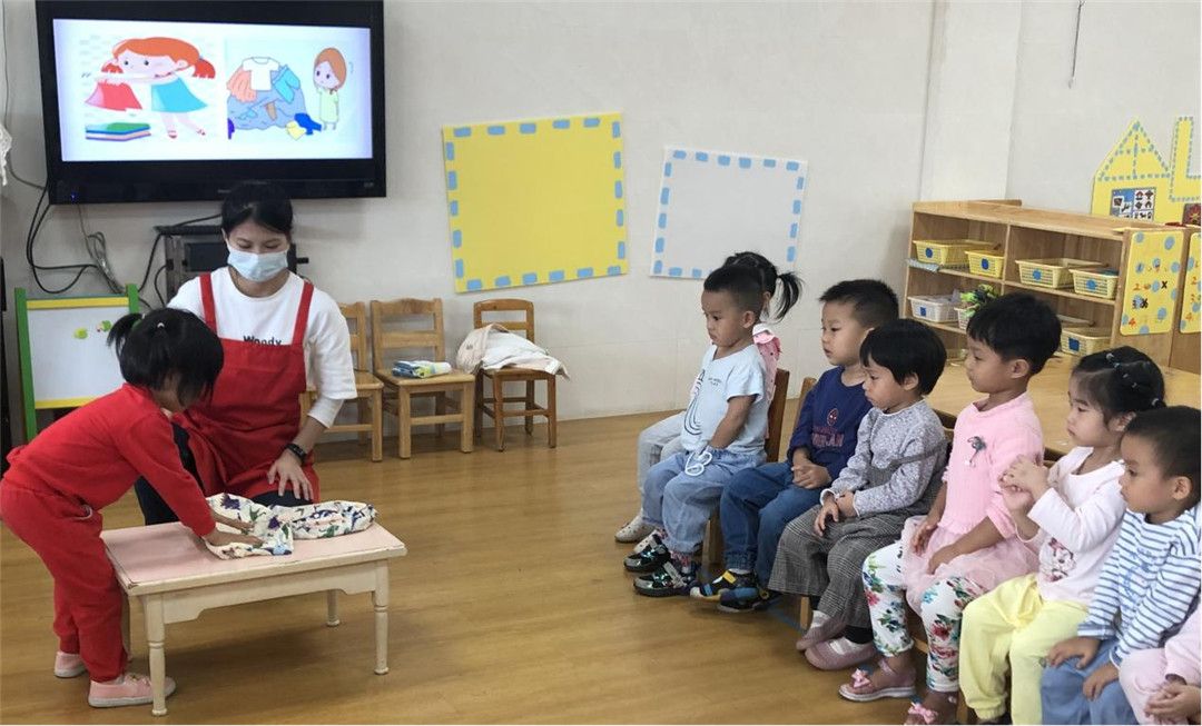 瞧!宝贝们正认真地学习叠、穿衣服的本领。他们一边念儿歌,一边叠衣服。