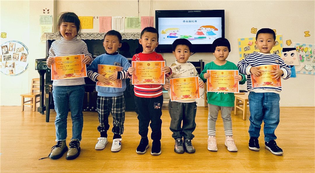 噔噔蹬蹬~请小七班的“穿、叠”小达人上台领奖,我们为得奖的宝贝们鼓掌祝贺吧!