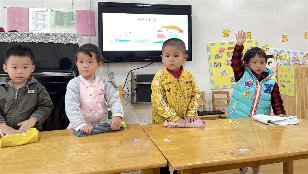 “叠裤子,排两队,变一队,弯弯腰。”看,我们很快就把裤子叠好啦!