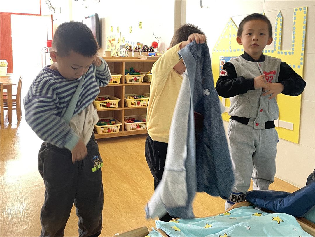 宝贝们准备睡午觉了,他们一个个正在脱外套呢!