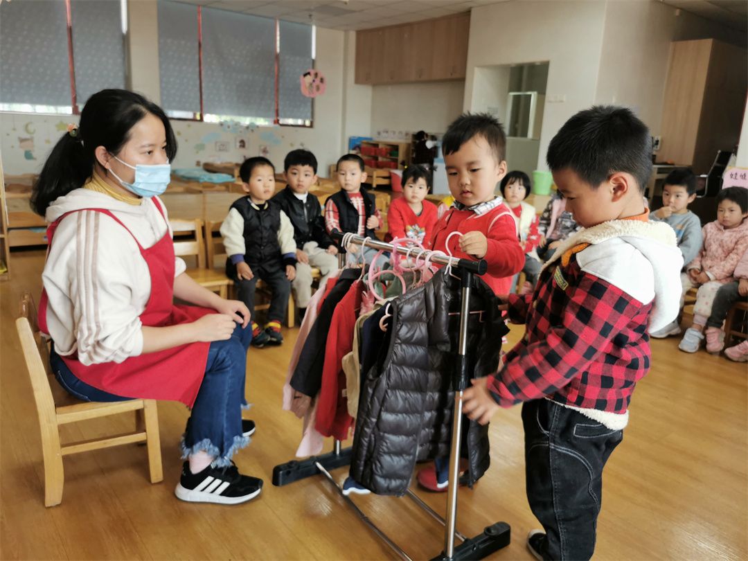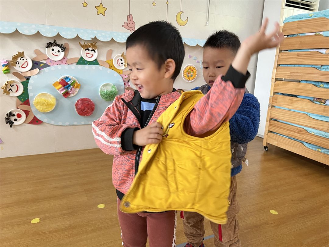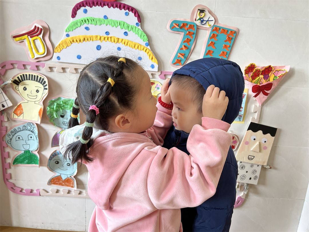 冬天来啦,要记得穿大衣戴帽子哦!你来帮我穿衣服,我来帮你戴帽子。