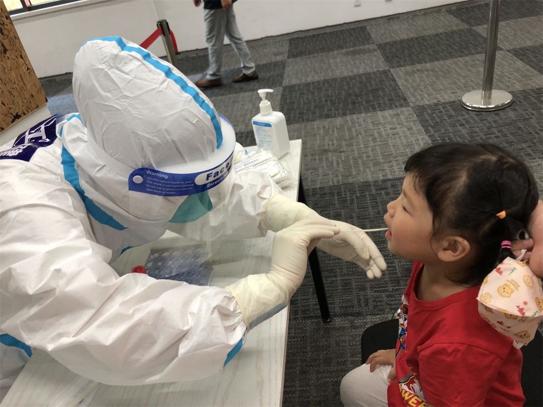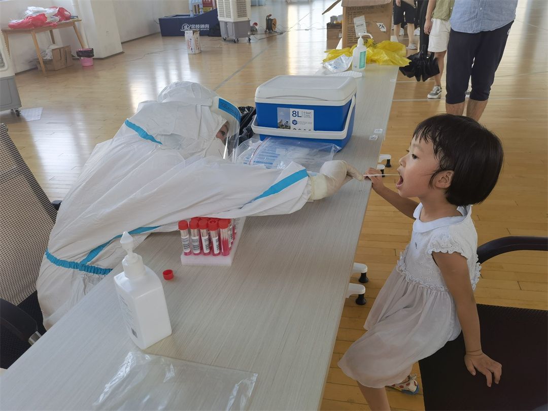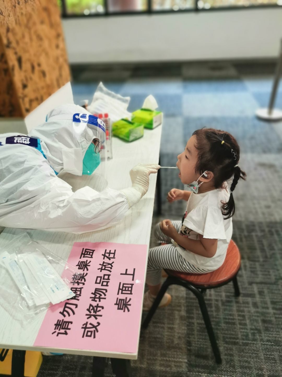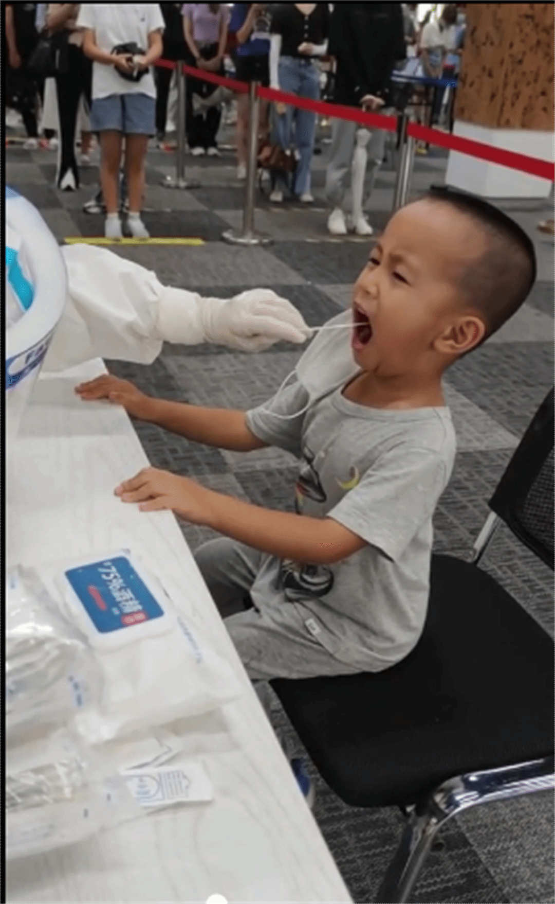 “小黄鸭 叫嘎嘎 核酸检测不害怕……张开嘴巴啊啊啊,轻轻一擦就好啦……”一起来瞧瞧,小宝贝们跟歌曲里的小黄鸭一样能干,自己踩着地标排好队,全力配合着医生张大嘴巴,你看这神气的样不由得让老师为他们竖起大拇指点赞。