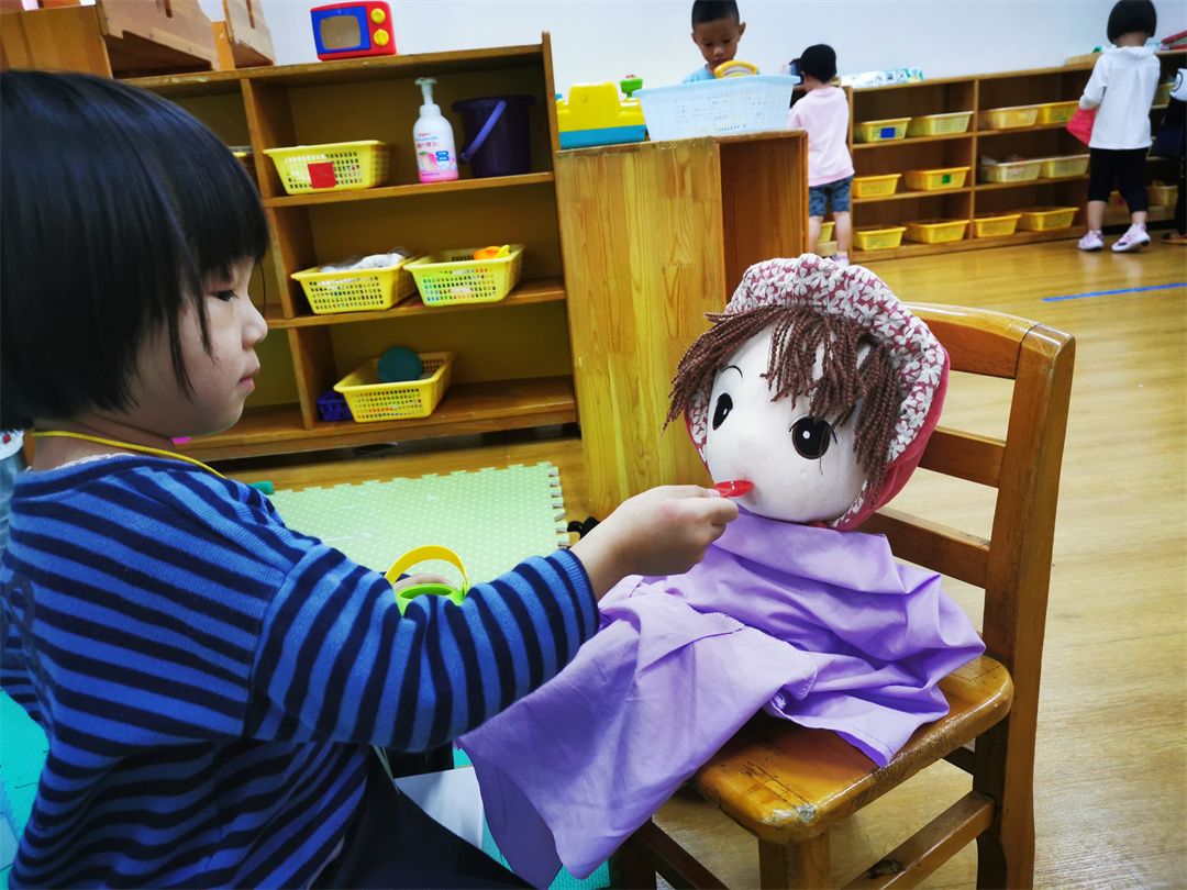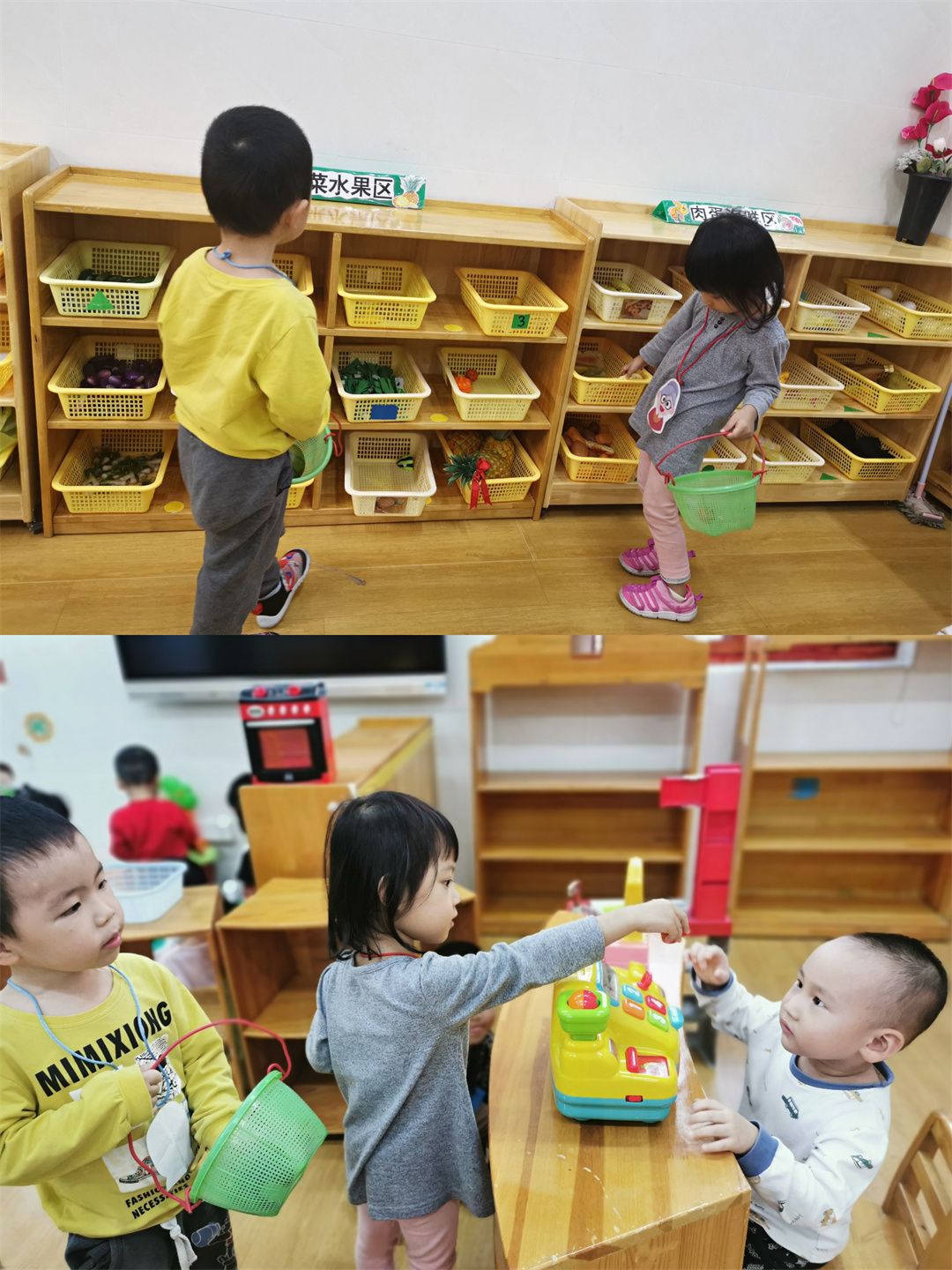 角色游戏,我们开心地模仿现实生活中的活动。我扮演的是一位“妈妈”,我正在喂宝宝吃饭。我们还能到超市购物呢!