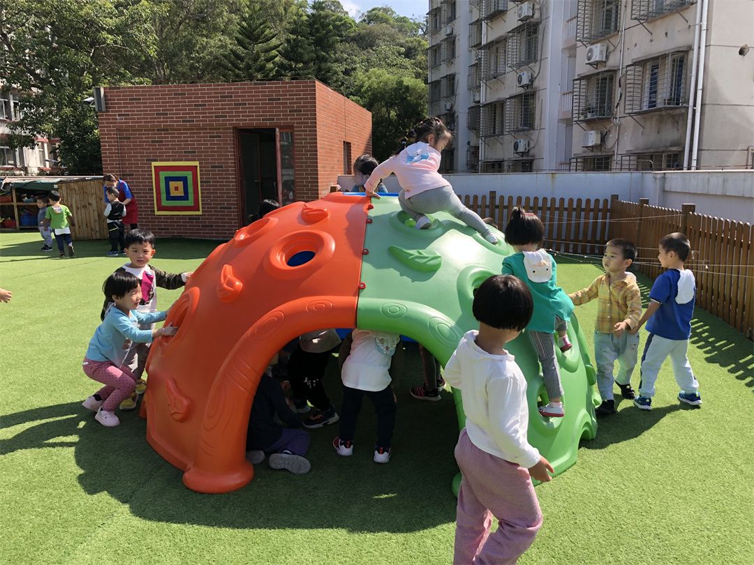 攀爬活动我能行!这是小朋友很喜欢的大型活动器械“乌龟壳”。小朋友们可以自由的进行攀爬,谁最先爬到龟背触摸到龟壳为胜呦!龟壳下小朋友们还可以自由地做各种游戏活动,可有趣啦!