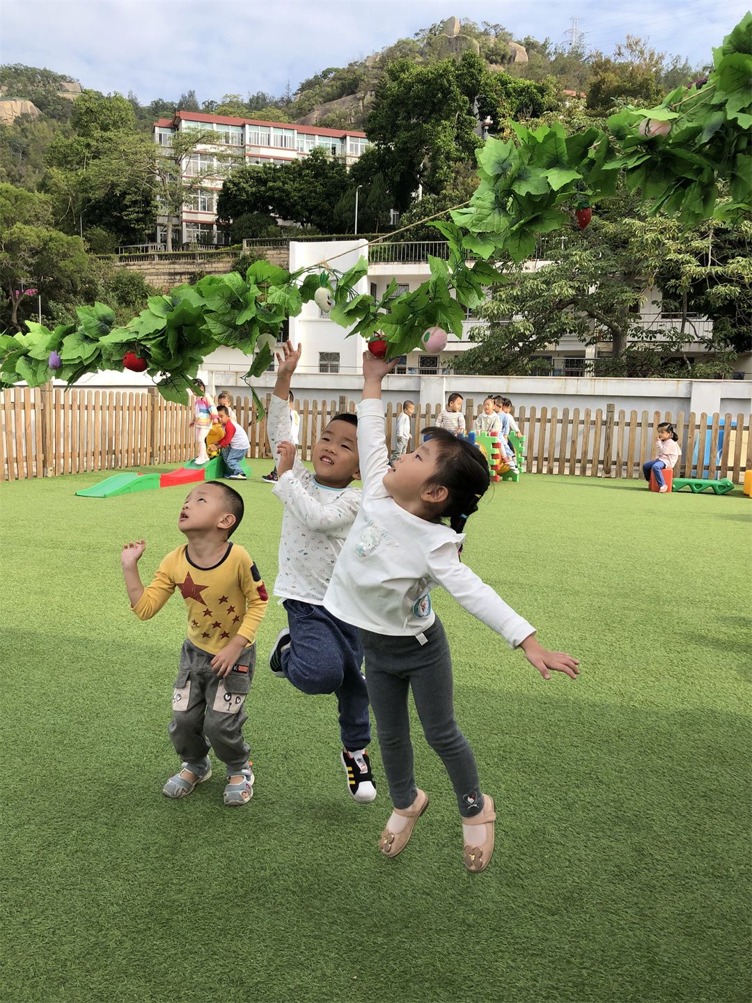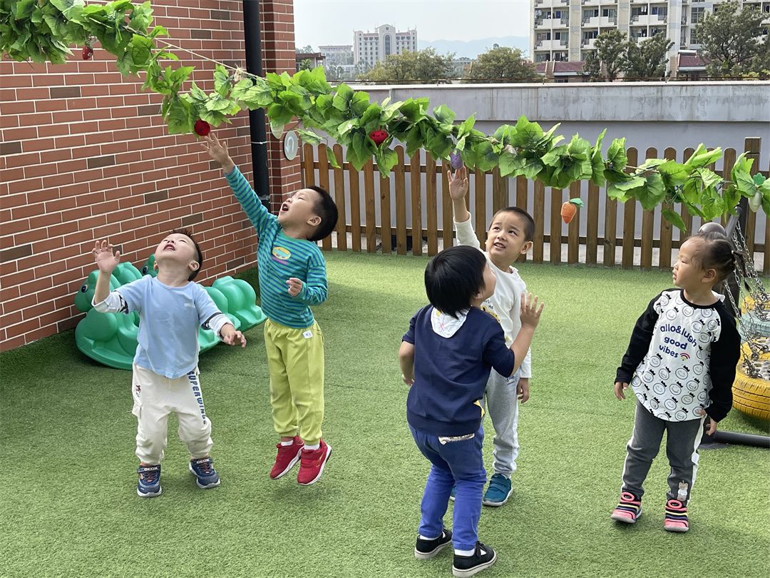 藤条上挂满了各种各样的水果,小朋友进行弹跳,谁的小手触碰到水果就可以得到奖励,小朋友们可积极了,来吧!咱们来比比赛,看谁拍的水果多呦!
