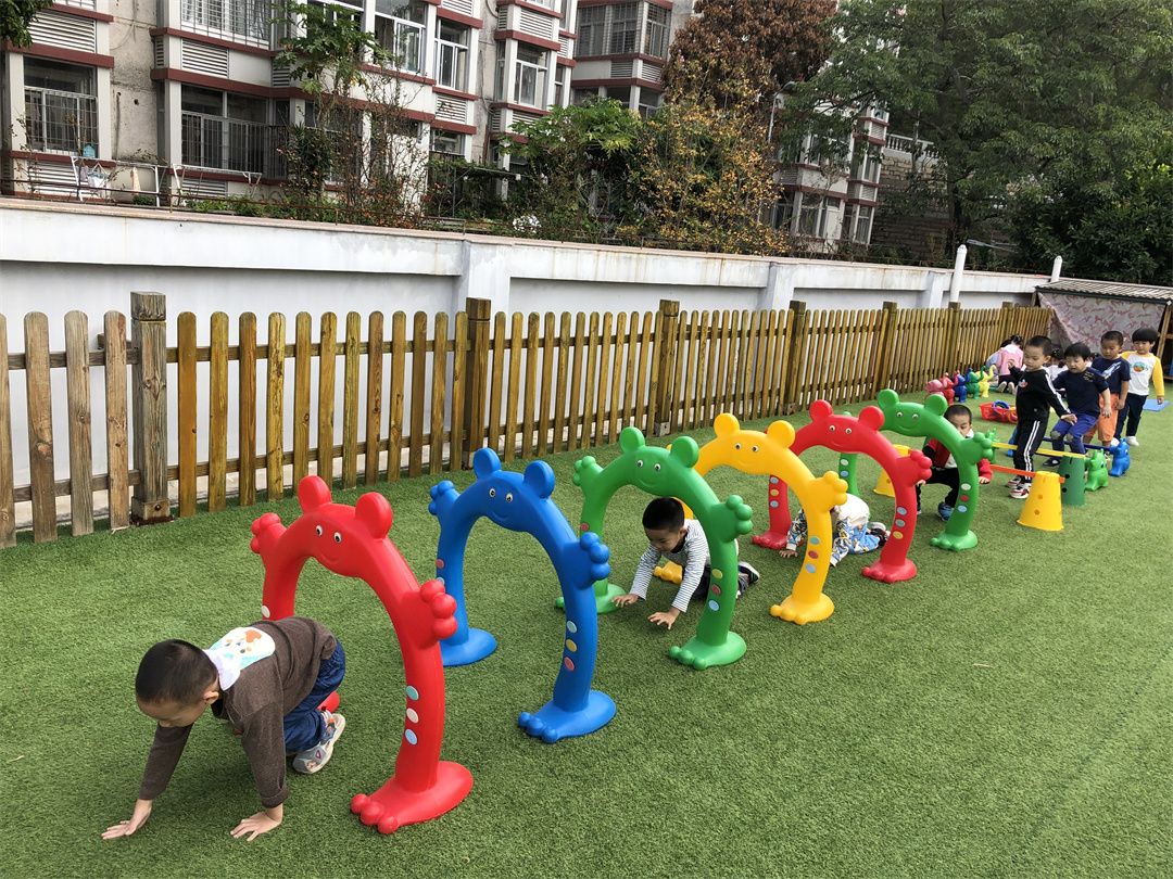 这两条“长龙”是小朋友们极其喜欢体智能操控区,它趣味性较强,孩子们参与积极性很高;走、跑、跳跃、钻、爬、平衡等一些基本动作的练习也能在游戏中得到保证,真正体现了游戏的娱乐性及教育性。瞧!小朋友们玩得开心极了!