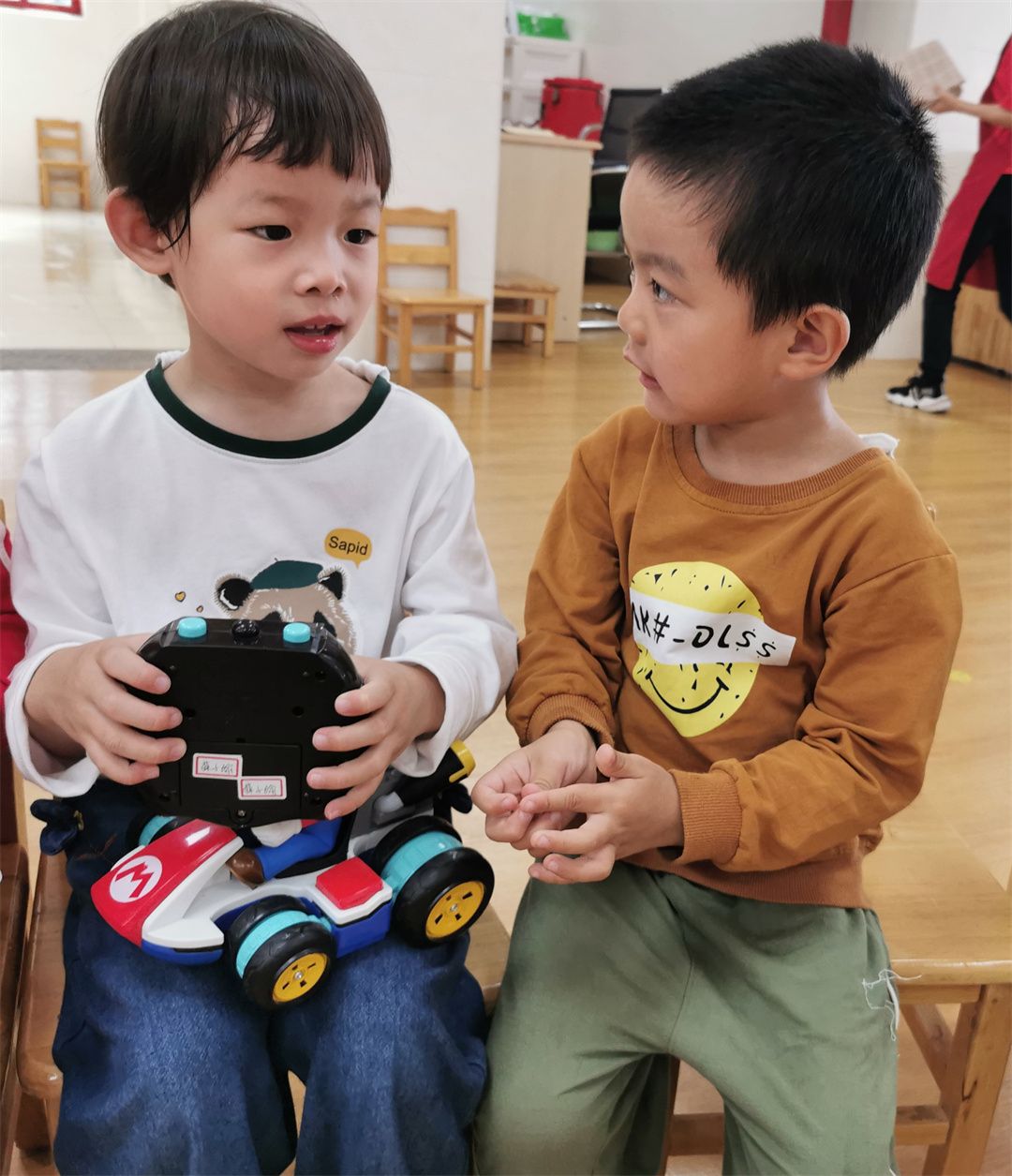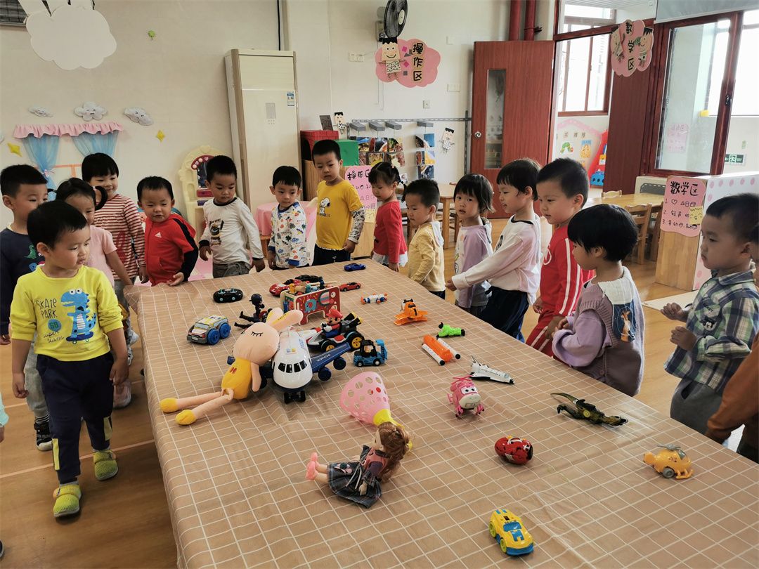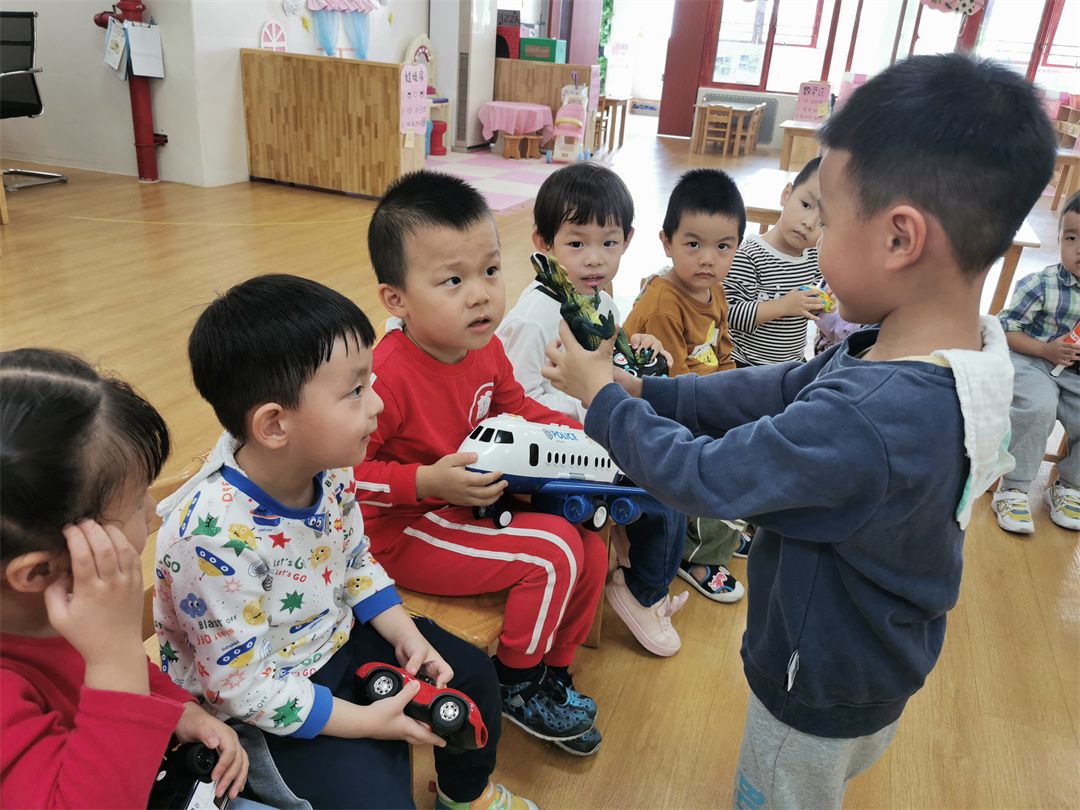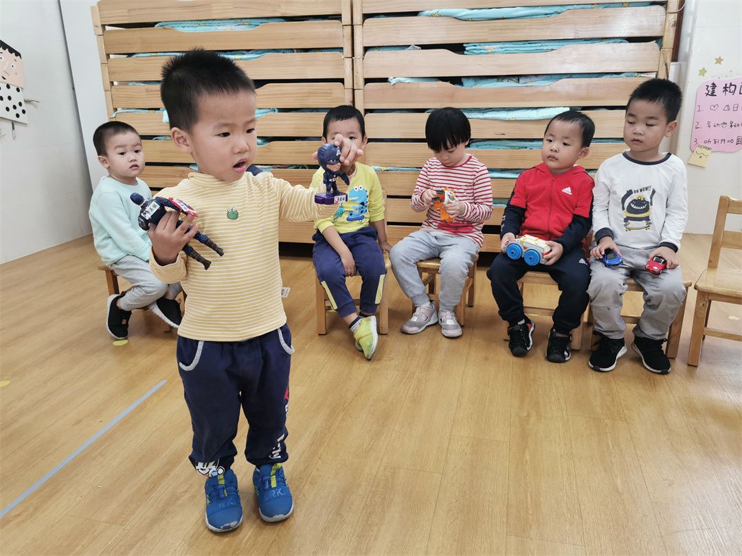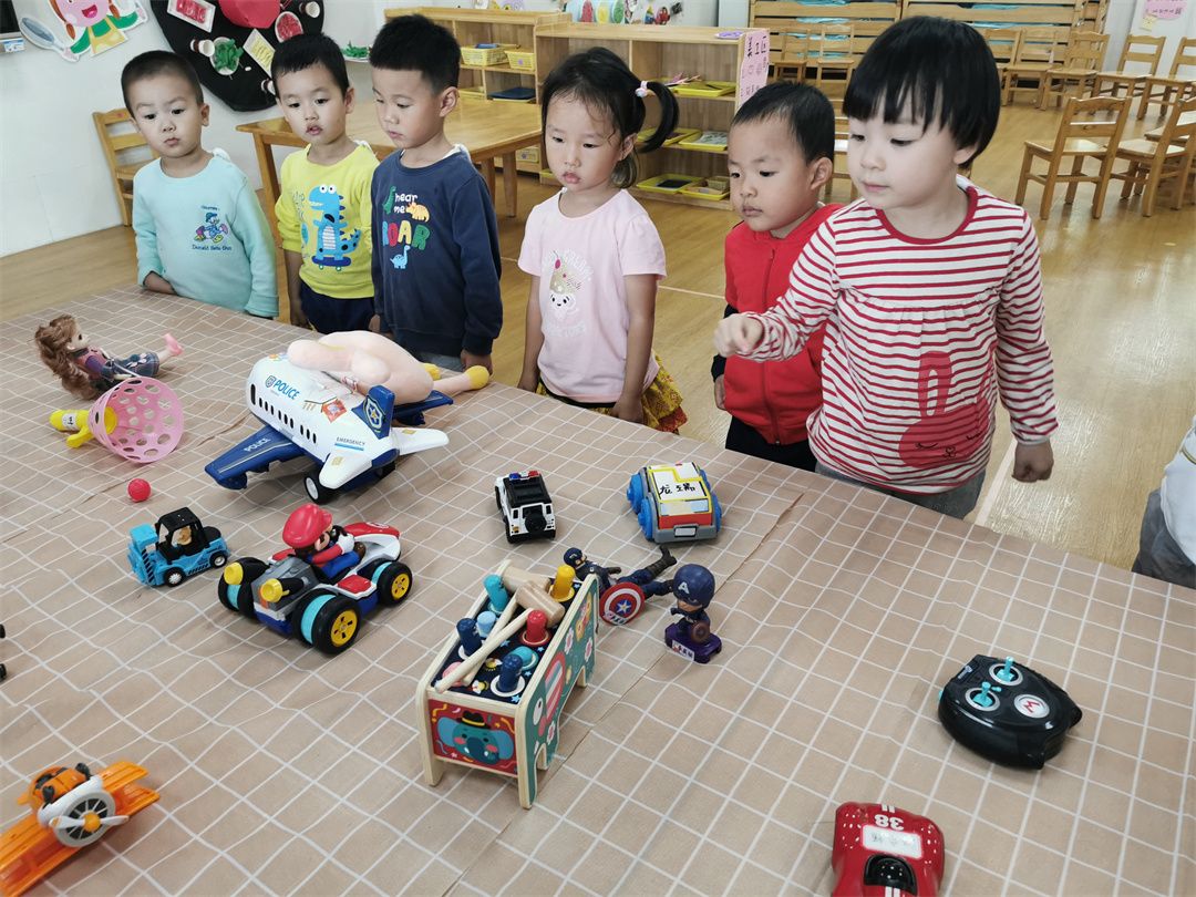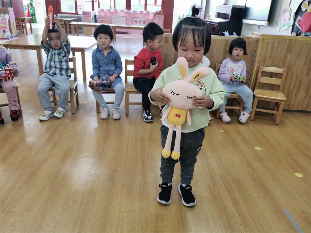 孩子们在满满的期待中,迫不及待的向老师、小伙伴们展示自己心爱的玩具,“这是我带来的飞机,它会飞,还会唱歌呢!”“可爱的小兔子布偶每天陪着我玩游戏。”“这是神气的超人,它会打怪兽!”“这是我的小恐龙,请大家注意听哦,它还会发出“哄哄”的声音呢!”“这是我最喜欢的抛接球,瞧!两手握在手柄,按下开关小球就飞出去啦!”