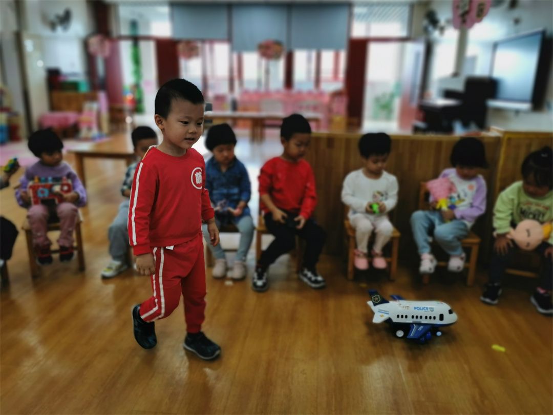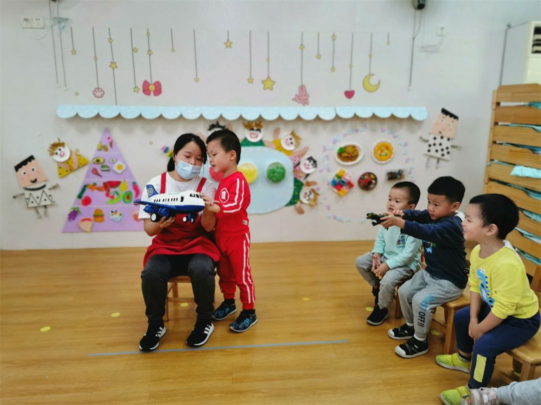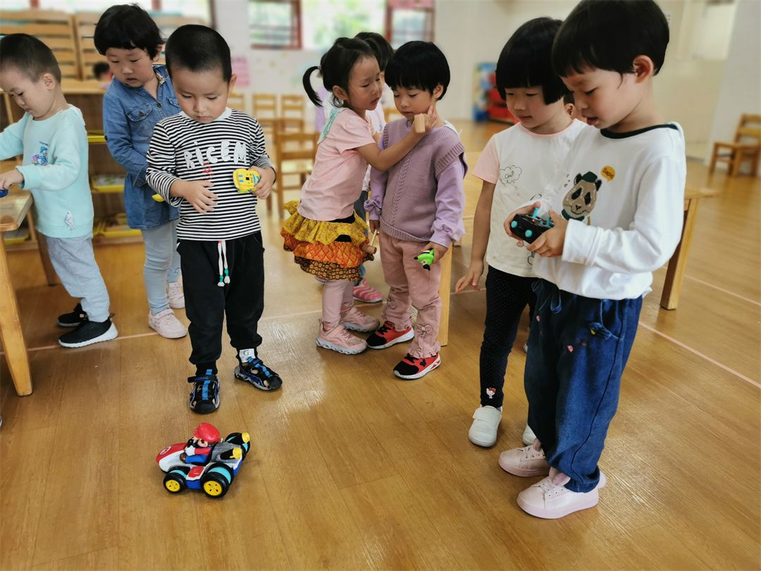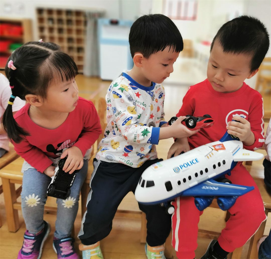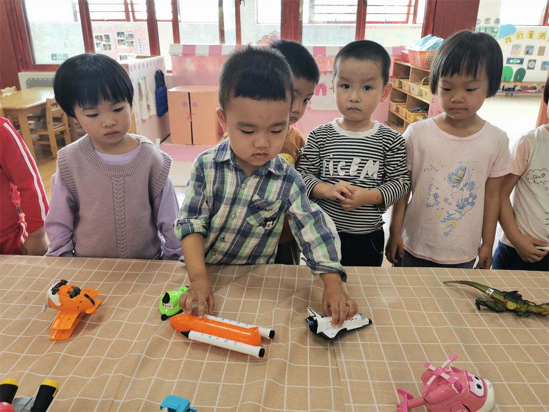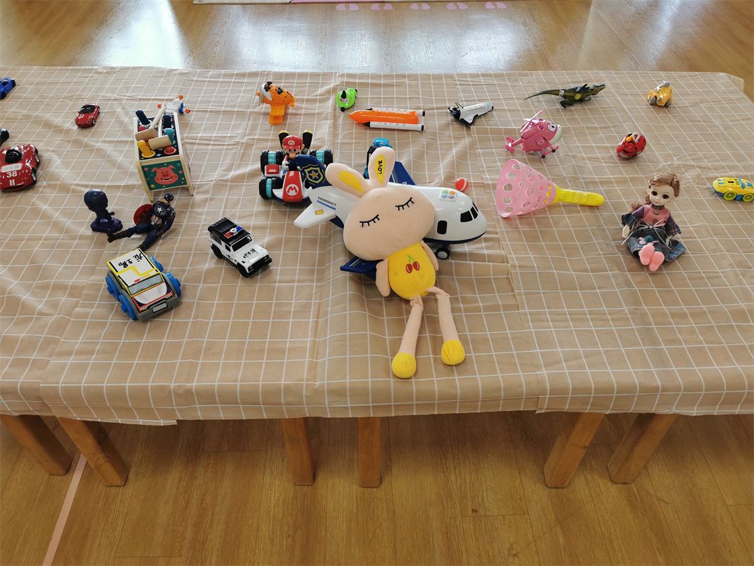 孩子们在满满的期待中,迫不及待的向老师、小伙伴们展示自己心爱的玩具,“这是我带来的飞机,它会飞,还会唱歌呢!”“可爱的小兔子布偶每天陪着我玩游戏。”“这是神气的超人,它会打怪兽!”“这是我的小恐龙,请大家注意听哦,它还会发出“哄哄”的声音呢!”“这是我最喜欢的抛接球,瞧!两手握在手柄,按下开关小球就飞出去啦!”