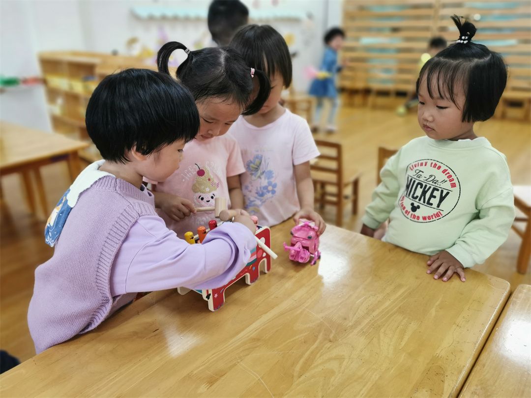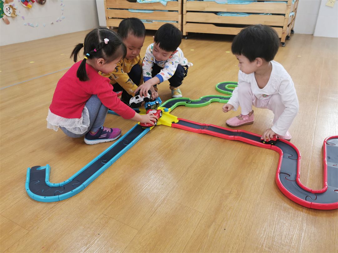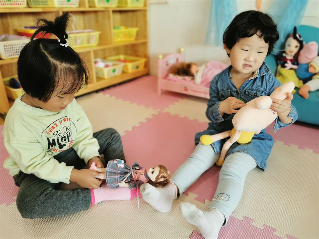 于是,孩子们开始了与同伴、共享玩具的快乐时光!有的宝贝迫不及待地在汽车跑道上玩起了小汽车,有的宝贝抱着布娃娃一起到娃娃家去做客,还有的和小伙伴一起在桌面上玩起了打地鼠的游戏,活动室里不时传来孩子们阵阵的欢声笑语。