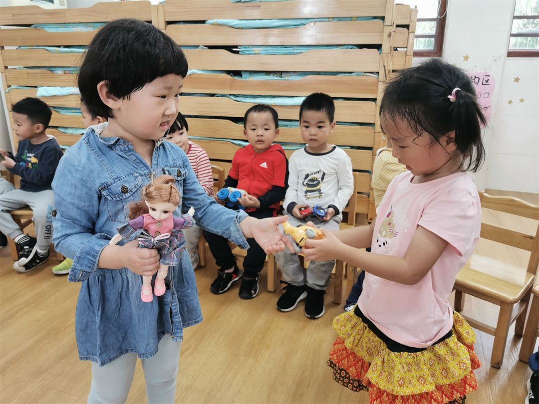 通过孩子们精彩的介绍,小四班的宝贝们明白了分享的快乐。交换玩具活动开始啦!瞧,孩子们很快就找到小伙伴,交换到了自己心仪的玩具,还互相交流着玩具的玩法:布娃娃换到了直升飞机、小汽车换到了大飞机、积木换到了小汽车……