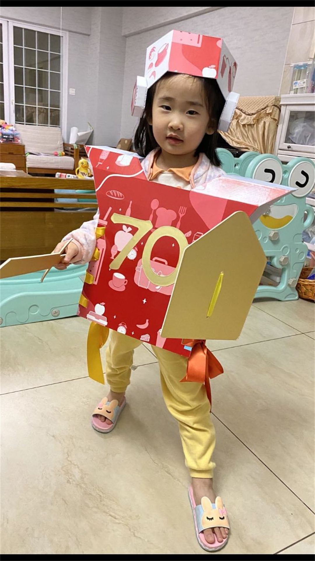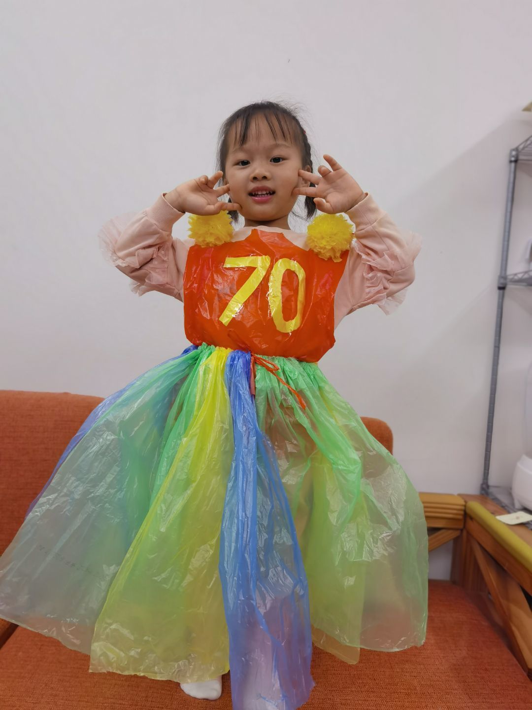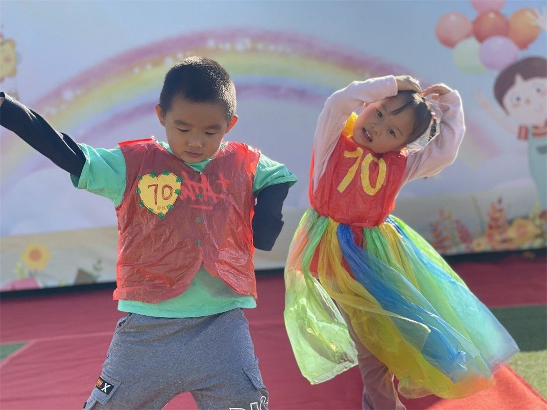 我们倡导绿色、环保、节约的理念,变“废”为“宝”,在周末或平时在家的闲暇时光,小朋友和爸爸妈妈们齐动手,充分利用购物袋、纸箱、塑料袋、报纸等废旧材料,制作出各式各样时尚多彩的、包含有关“70”园庆元素的各种服装。每个小朋友在设计服装中都融入了对幼儿园妈妈满满的爱!充分体现了环保理念和幼儿的想象力、创造力。
