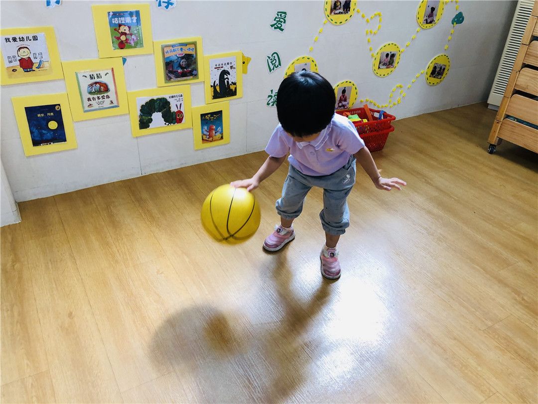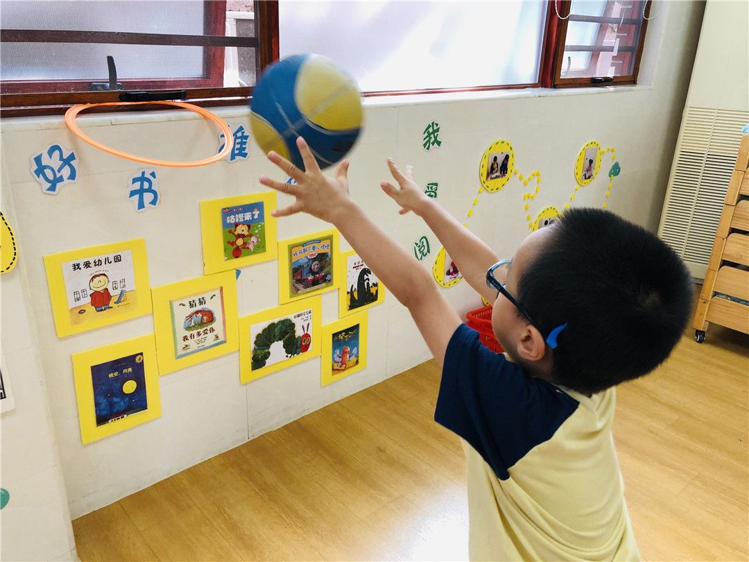 足球的天地不只是在足球场,活动室里,他们同样欢愉。在雨声的伴奏下,孩子们在自己温馨的班级里和足球做起了游戏,投篮筐,拍球乐,足球在跳动,孩子在欢笑。