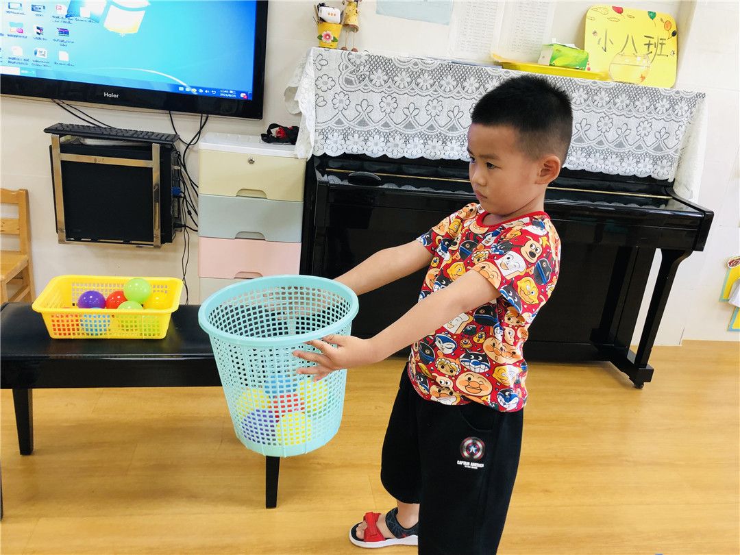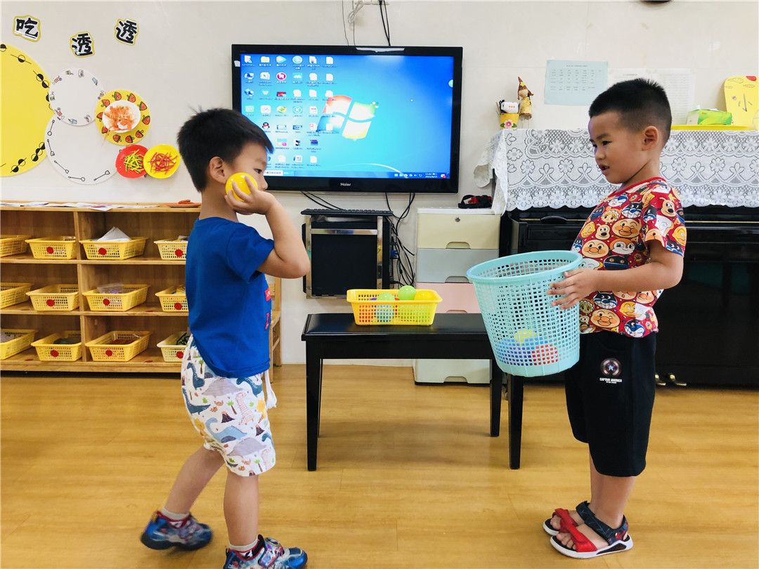 小小的网篓和五彩海洋球也能变成好玩的游戏材料哦!你瞧,两个小朋友一个人抛一个人接,彩色的海洋球便在空中形成一条带着笑脸的抛物线。