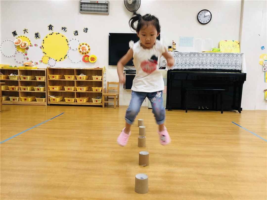 我们每天用的卷心筒、呼啦圈都变成了小障碍物。看,我们跳得多高呀!