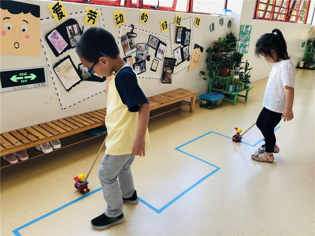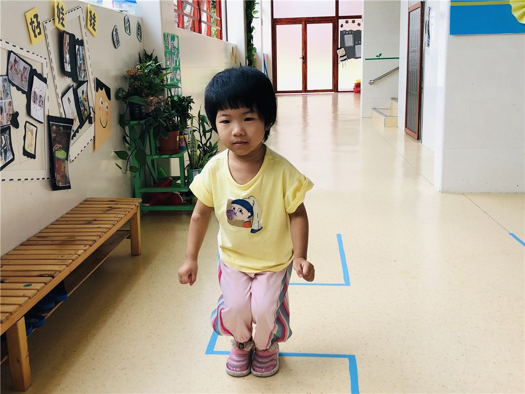 走廊上的“蓝色轨道”成了另外一处孩子们运动穿梭的小天地。孩子们单脚跳、双脚跳,玩得不亦乐乎。