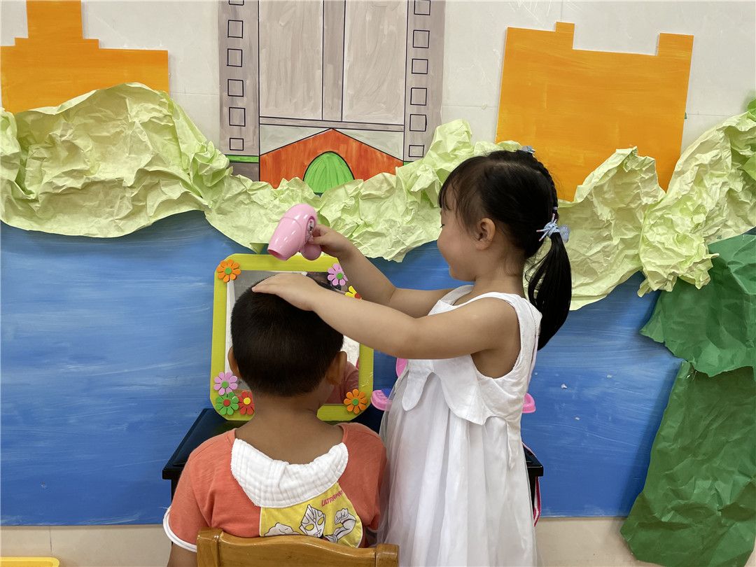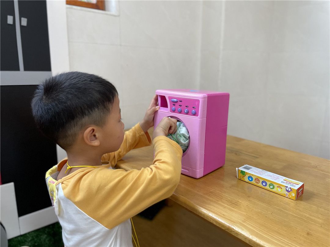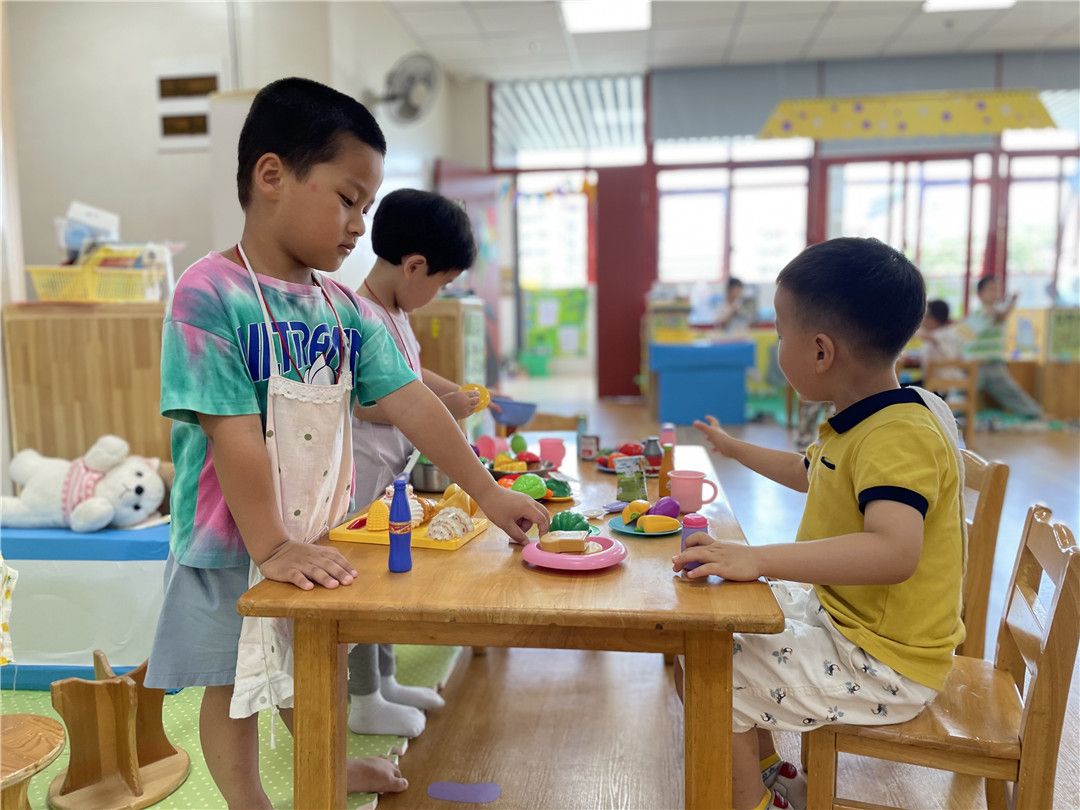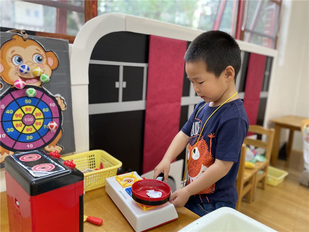 娃娃家里的“爸爸,妈妈”正在打扫着房间,照顾宝宝,煮饭炒菜,好一阵忙活。
