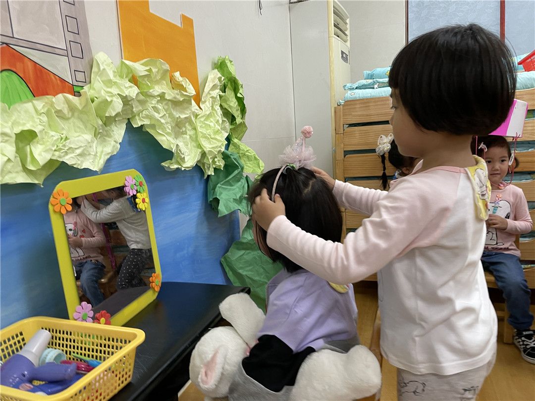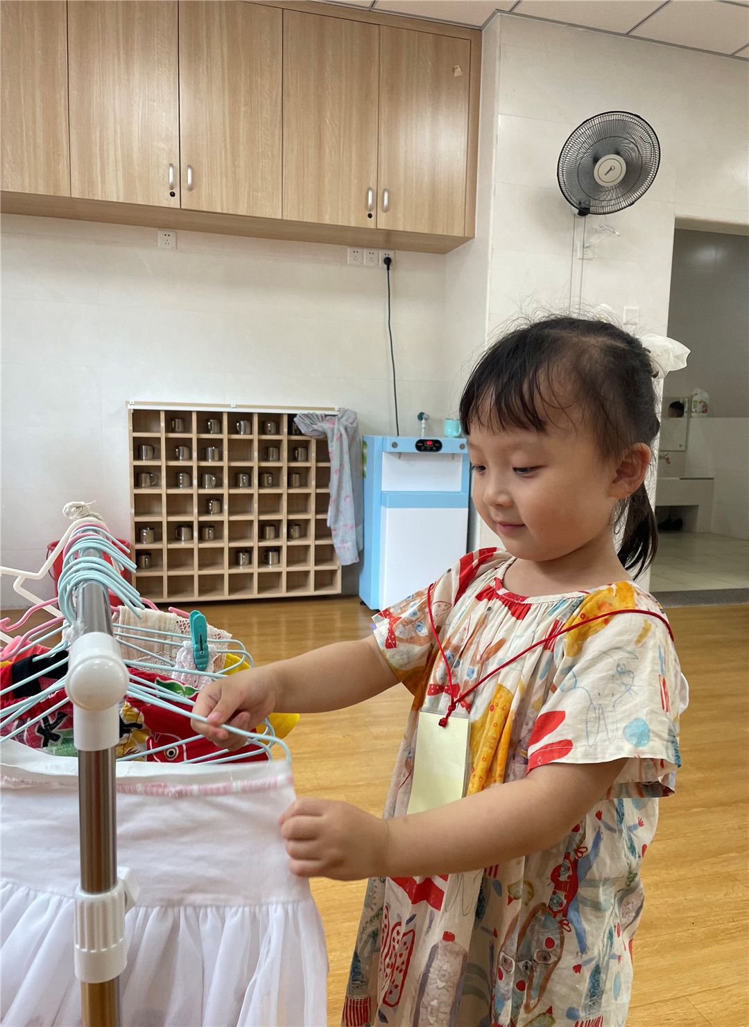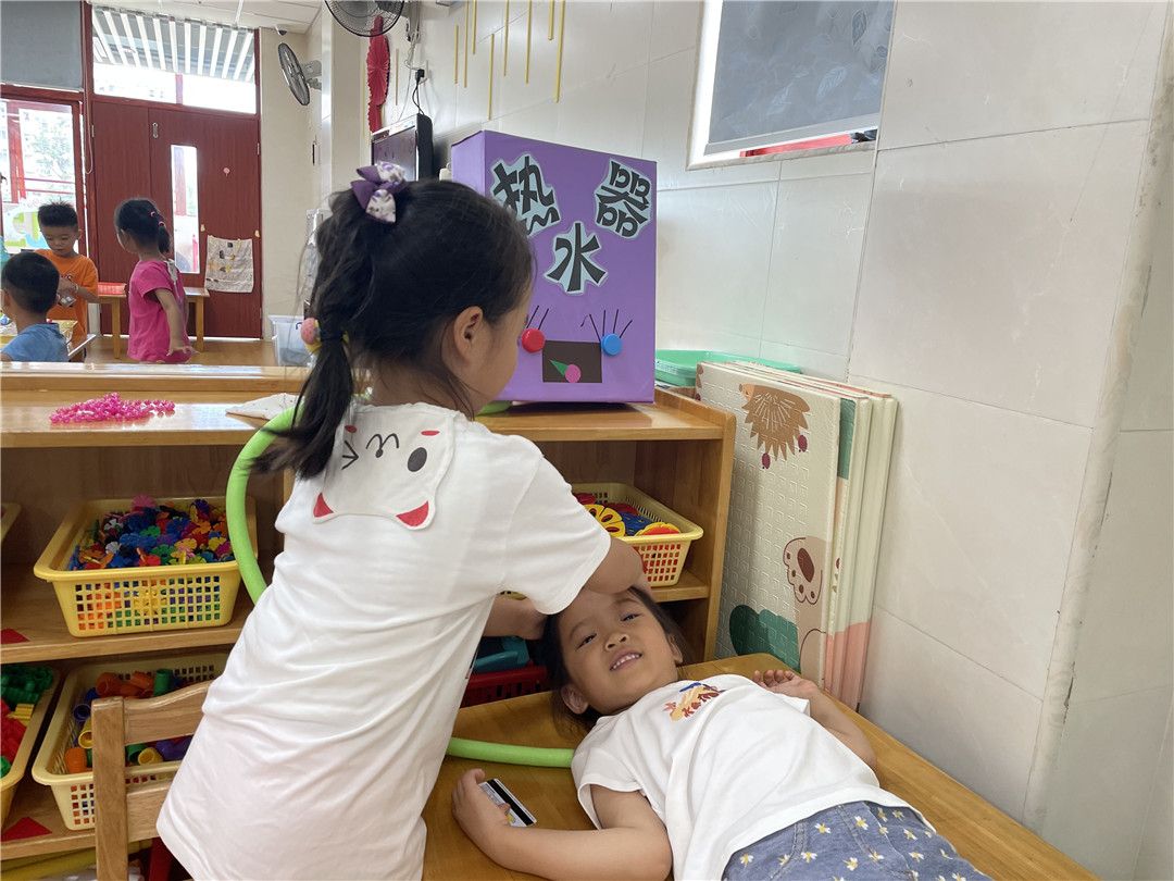 娃娃家里的“爸爸,妈妈”正在打扫着房间,照顾宝宝,煮饭炒菜,好一阵忙活。