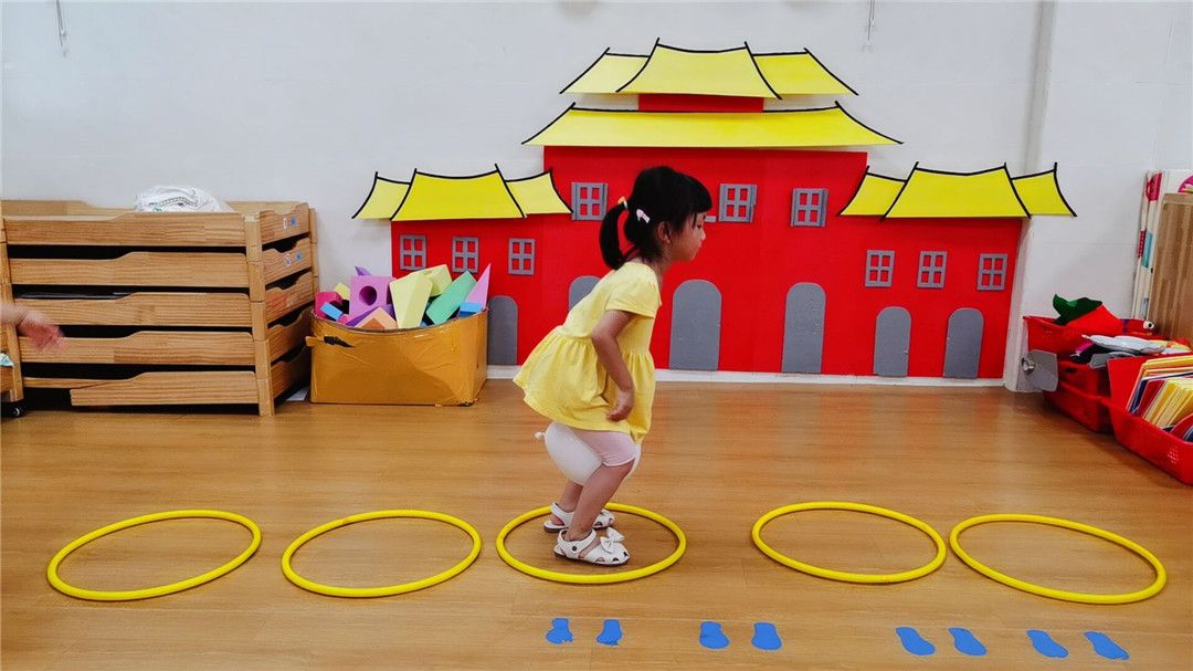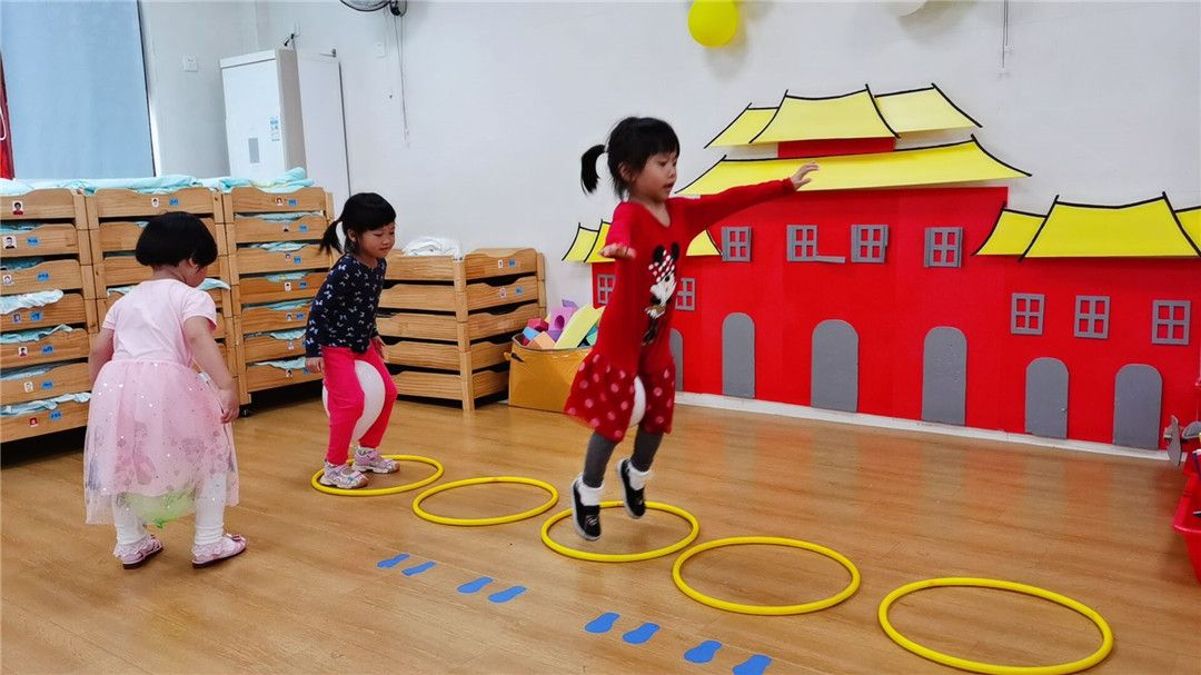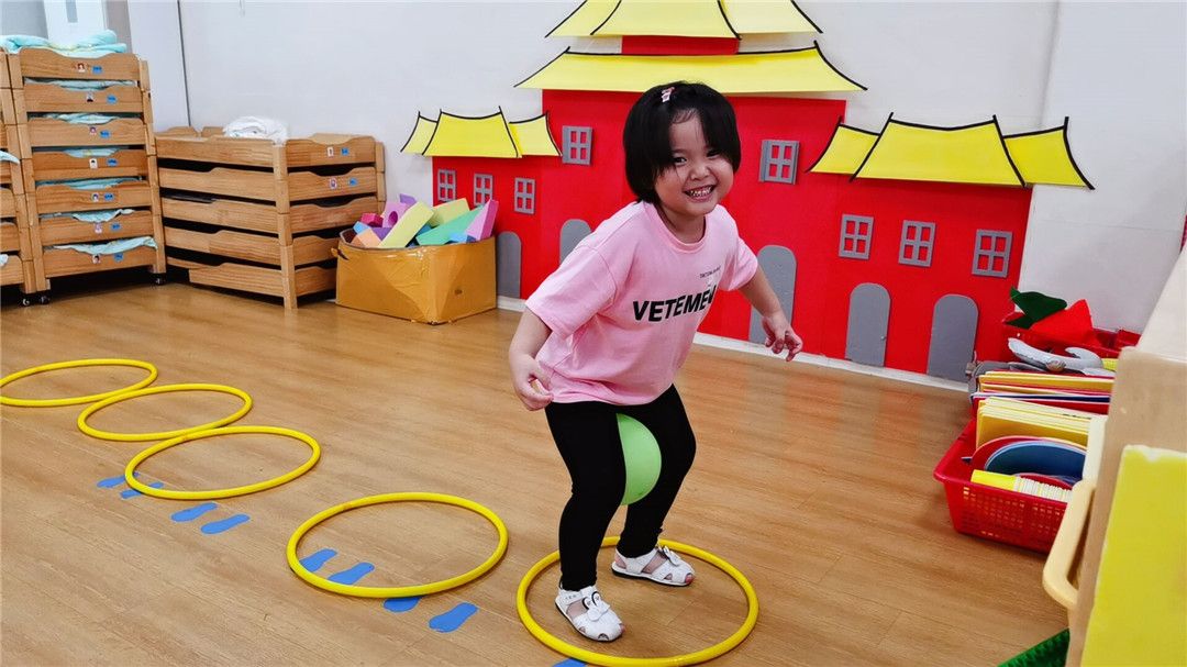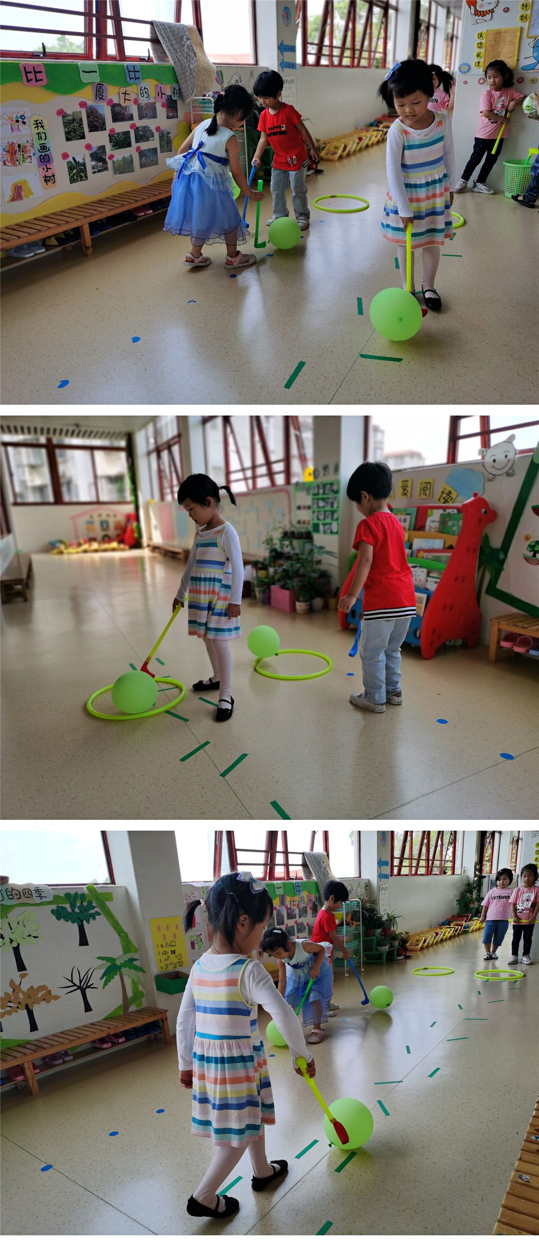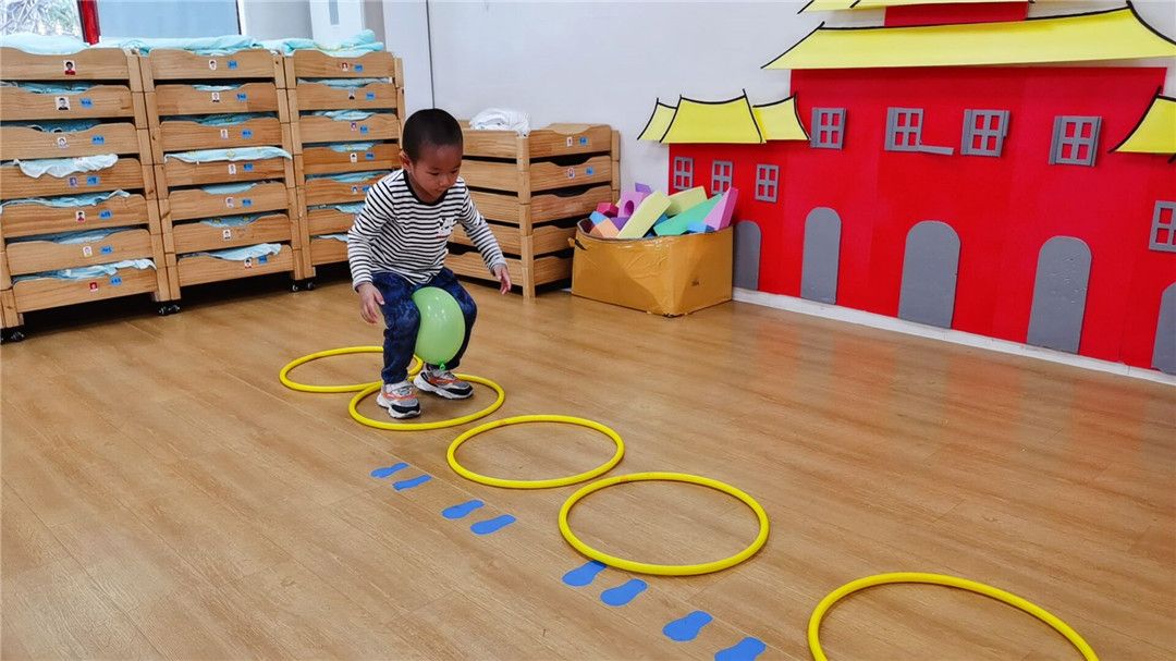芊芊、柔柔等小朋友都可以双腿夹住气球,稳稳地双脚往前跳。
