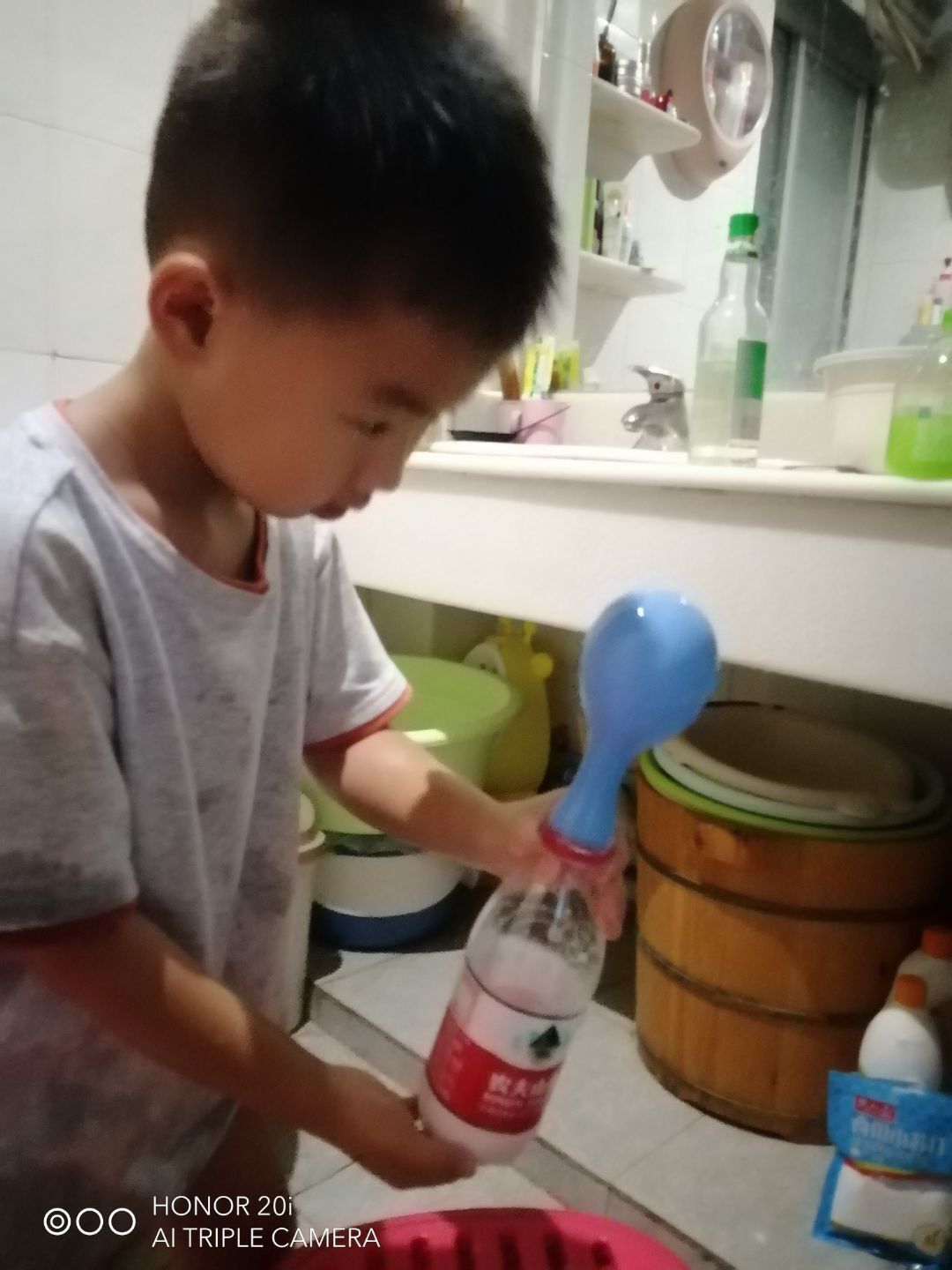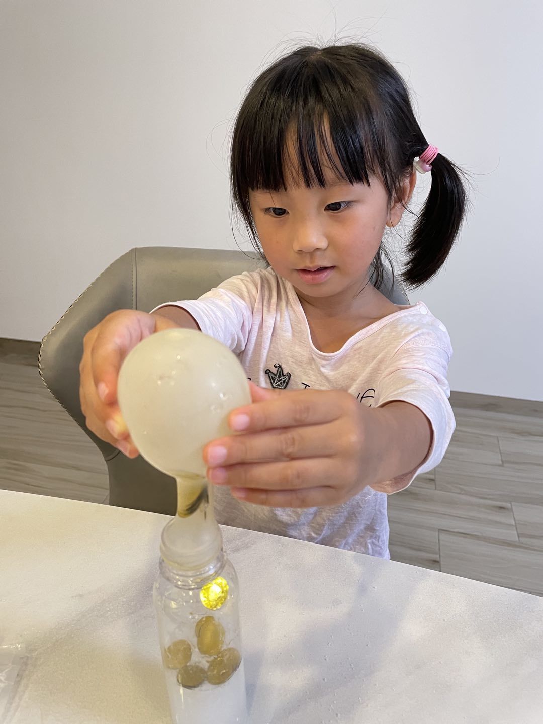 乐兮用力将矿泉水瓶压扁,矿泉水瓶里的空气都跑到气球里,气球立刻就鼓了起来。