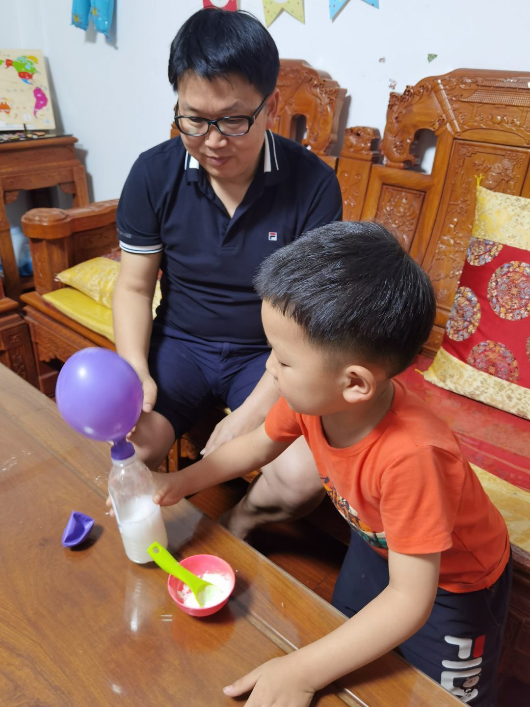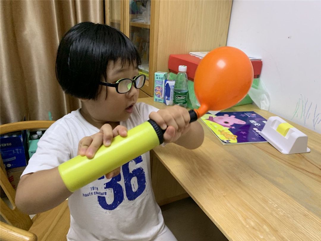 有一天,季睿对老师说:“老师,你每天都用嘴巴吹气球,太辛苦了。”于是小朋友们开始开动小脑筋一起想一想:除了吹气球,还有什么方法能让扁扁的气球鼓起圆圆的“肚皮”呢?