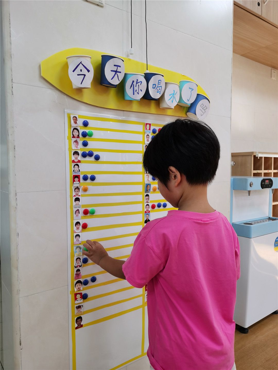 夏日炎炎,孩子们的户外运动、体育游戏之后往往是汗流浃背,需要及时补充大量水分。为了更好的鼓励孩子们多喝水并且观察孩子们的喝水情况,班级还设置了“今天你喝水了吗”打卡墙,孩子们喝完一大杯水后为自己贴上小磁铁,成就感满满。