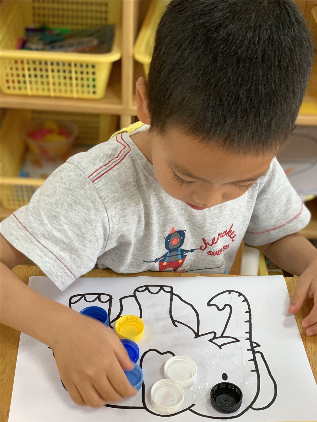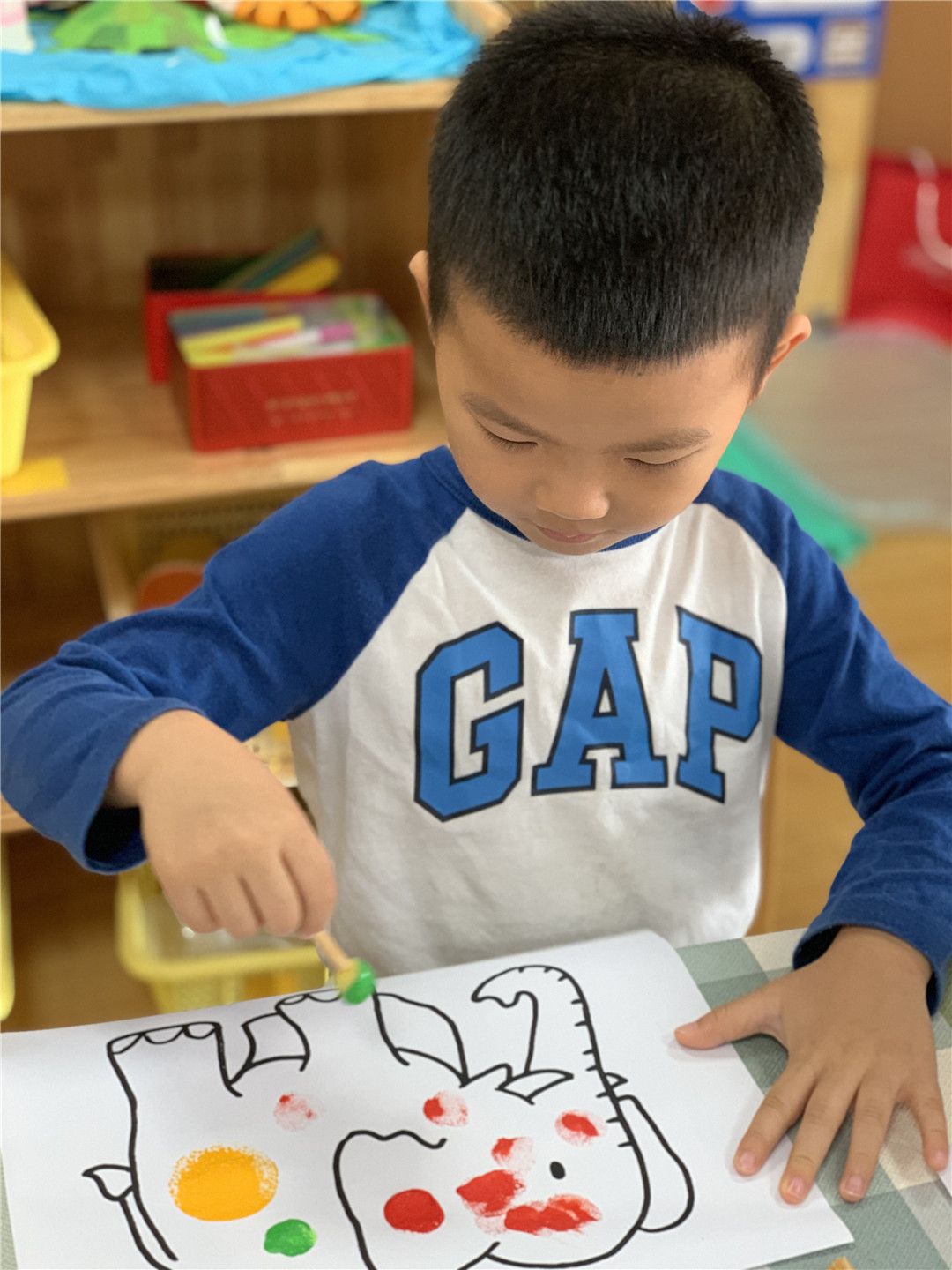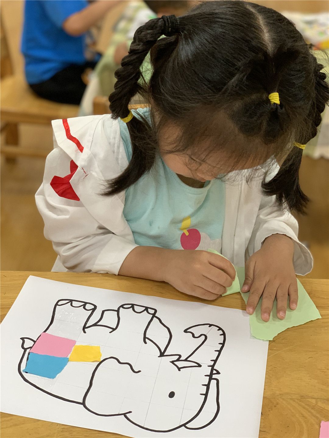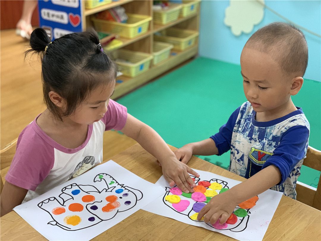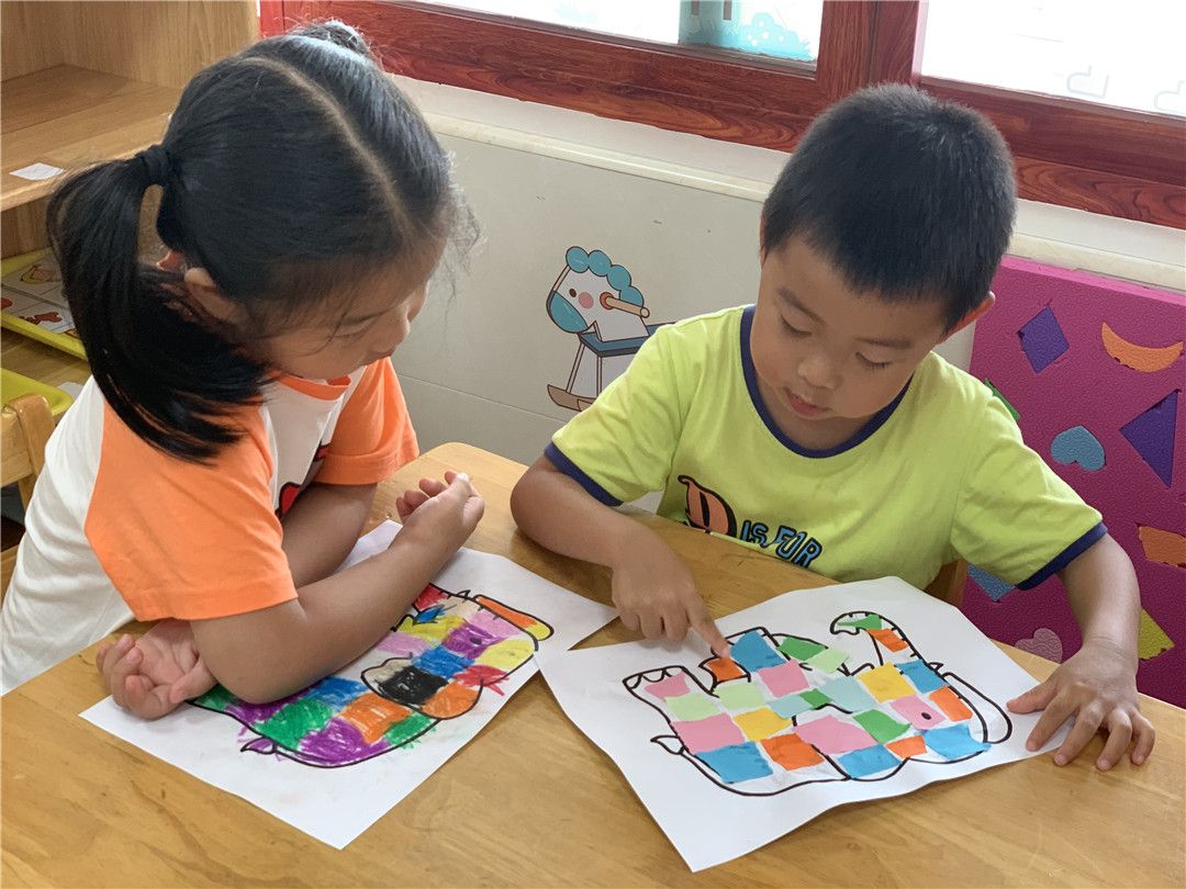 看着自己的成果,宝贝们迫不及待地和自己的好朋友介绍起自己给花格子大象设计的新衣服。