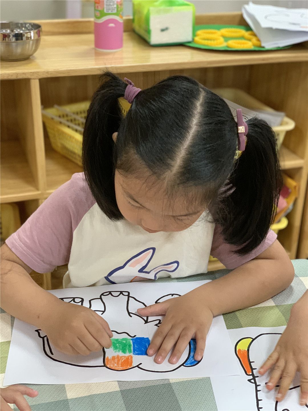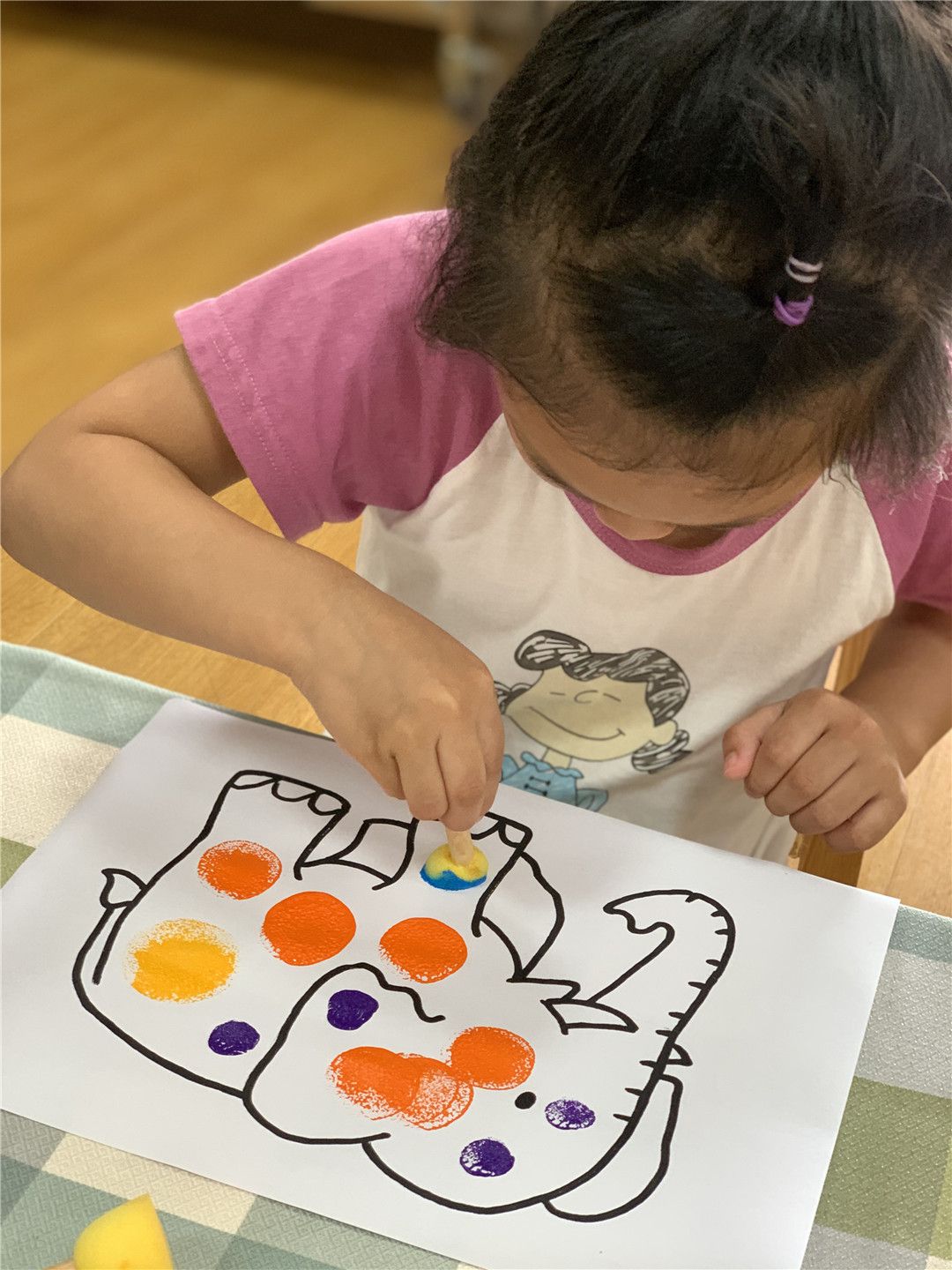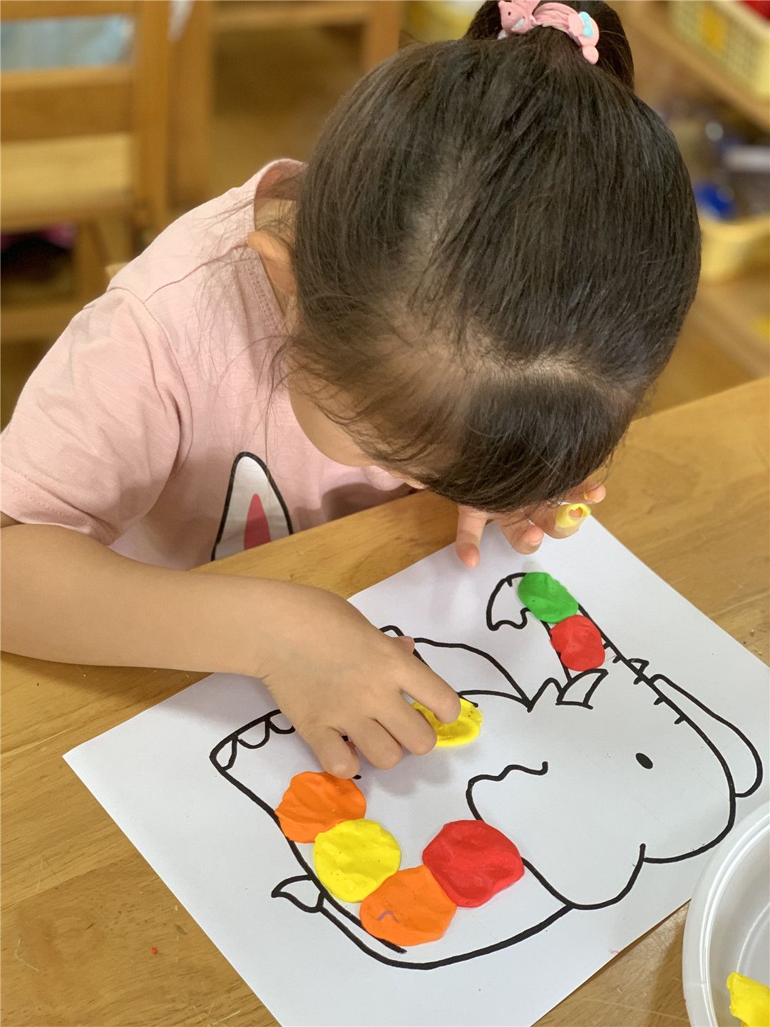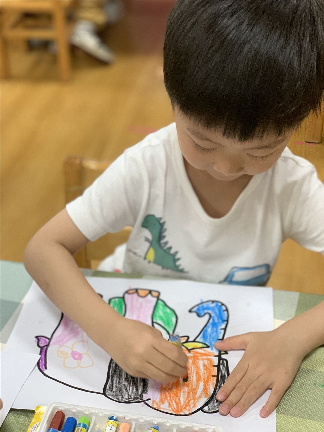 看着自己的成果,宝贝们迫不及待地和自己的好朋友介绍起自己给花格子大象设计的新衣服。
