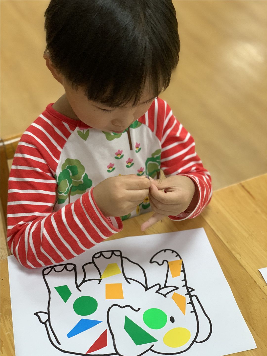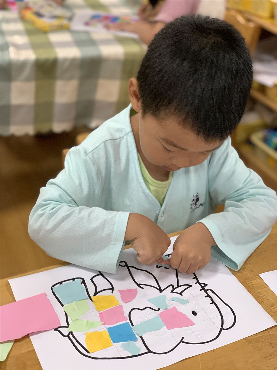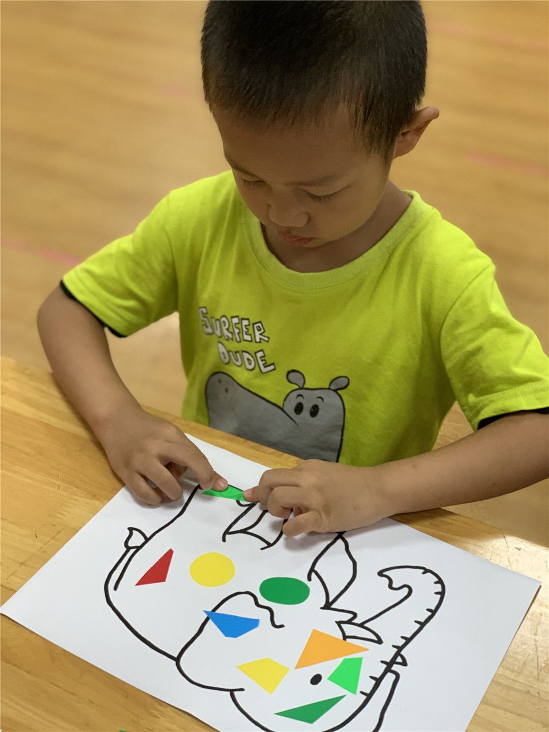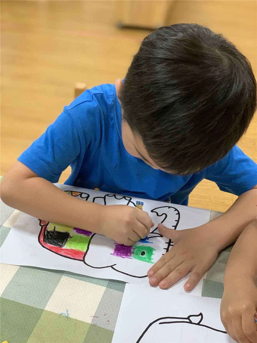 看着自己的成果,宝贝们迫不及待地和自己的好朋友介绍起自己给花格子大象设计的新衣服。