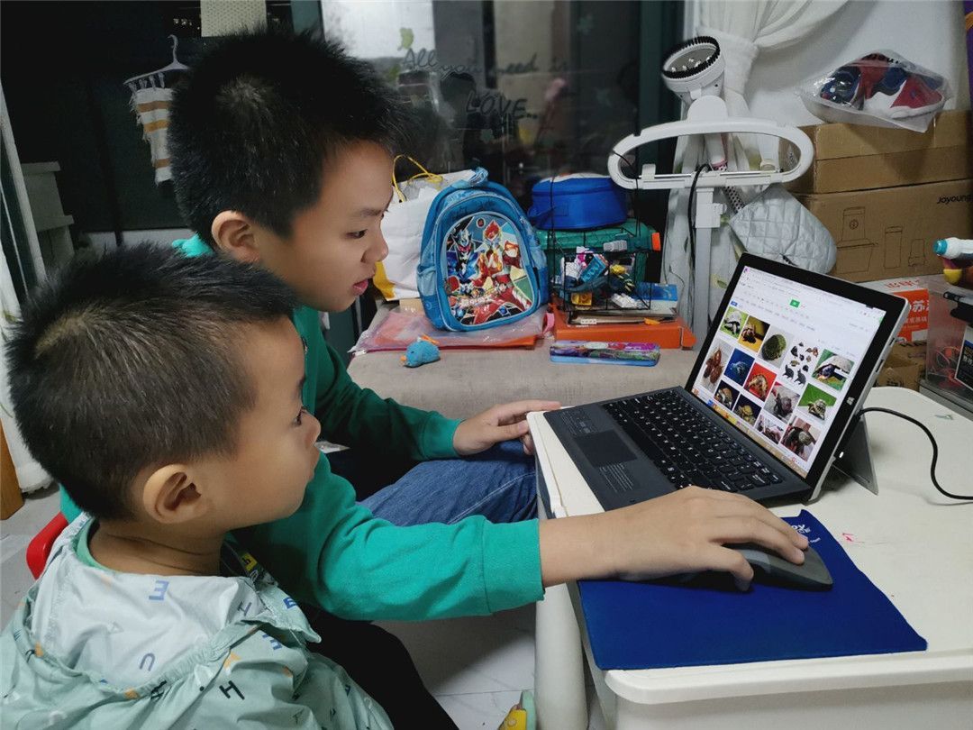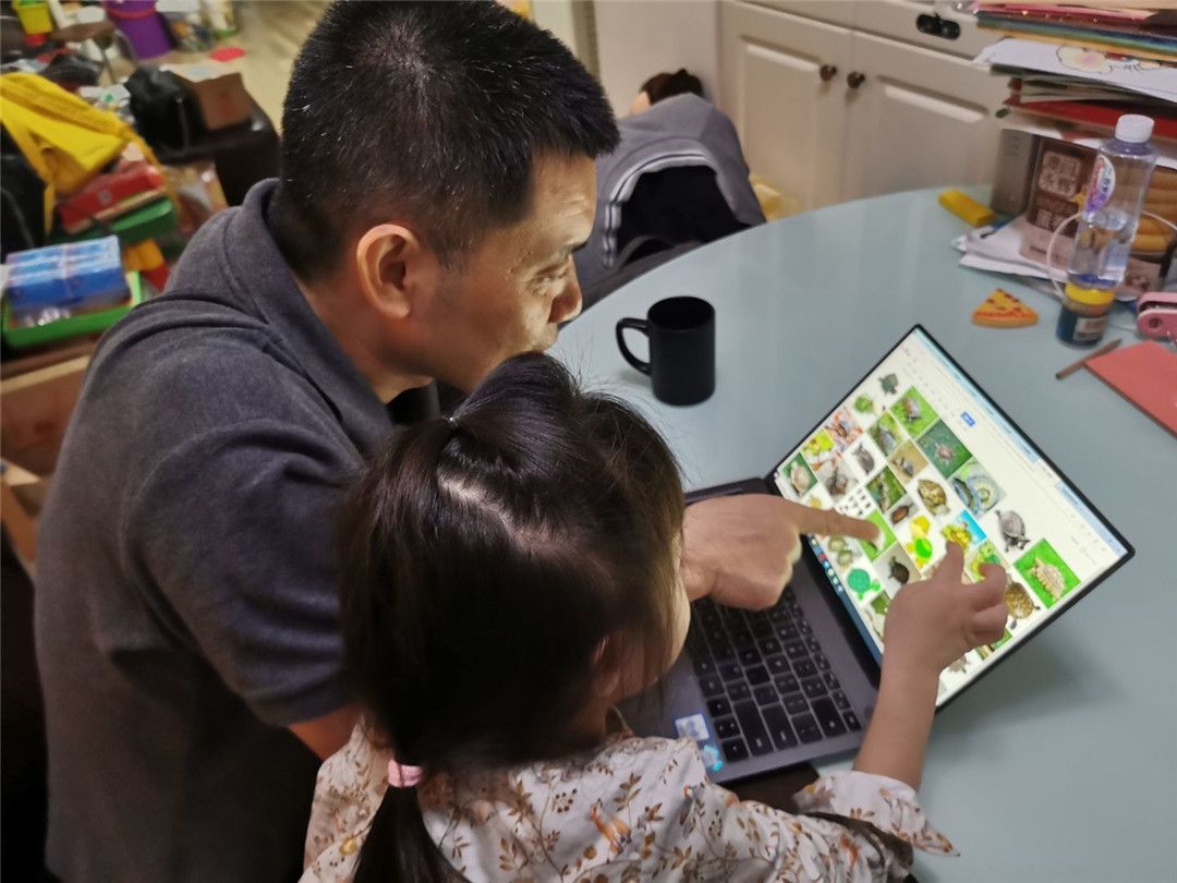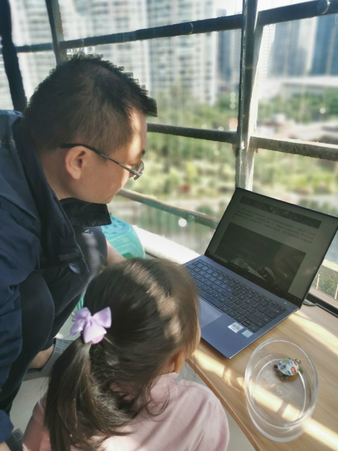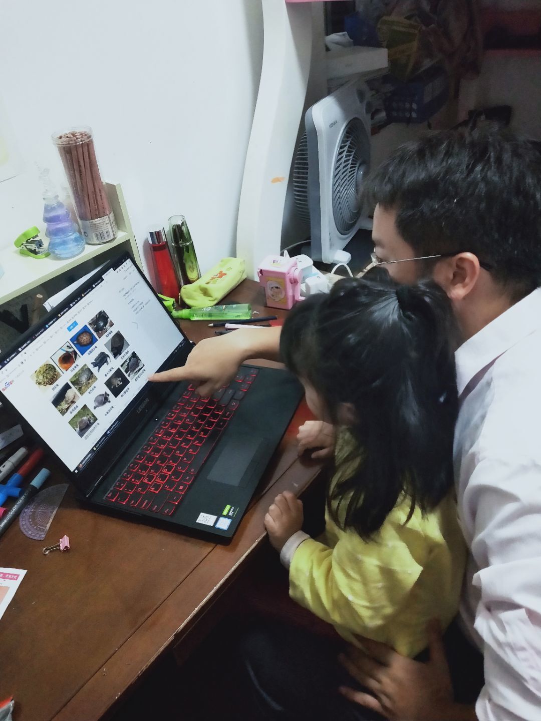 瞧!我正和爸爸一起查阅电脑上的资料哦!