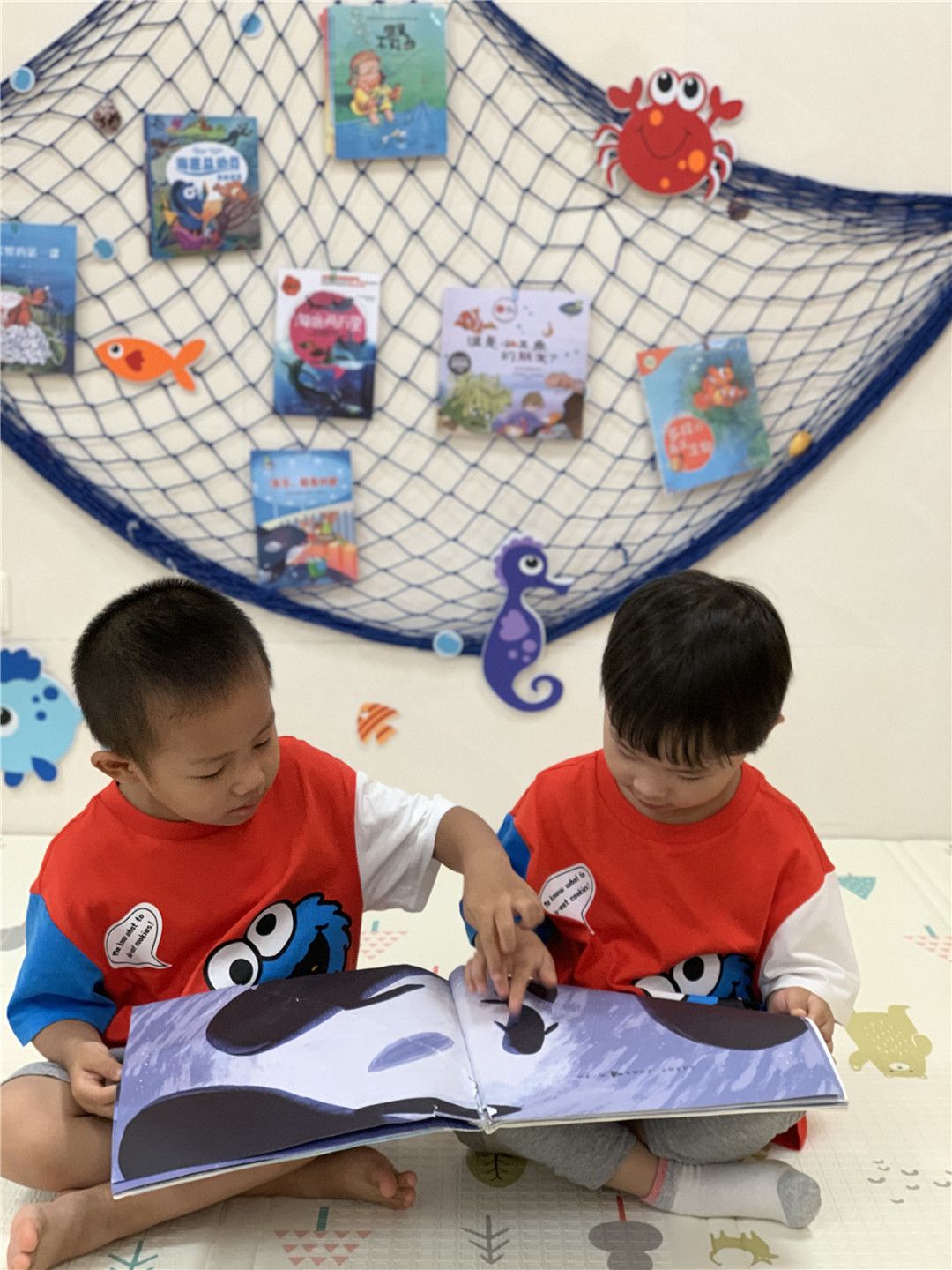 “这只小海龟真可爱!我也想要有一只。”帅仔也惊喜地说着。孩子们在区域活动中分享着充满着各种各样神奇动物的海洋绘本,绘本里精彩的海洋动物深深吸引了小朋友们。