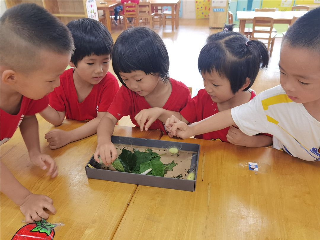 “老师,蚕宝宝吃的是什么呀?”“老师,它们能吃香蕉吗?我的香蕉可以给它吃吗?”“老师,这里面没有水,给它点水喝吧。”“老师,那叶子上的黑色点点是什么呀?”看着可爱的蚕宝宝,萌娃们满满的好奇心,无数的问题像美丽的烟花不断迸发。于是,孩子们变身为小小调查员,带着这些问题回家和爸爸妈妈调查起蚕宝宝的秘密。