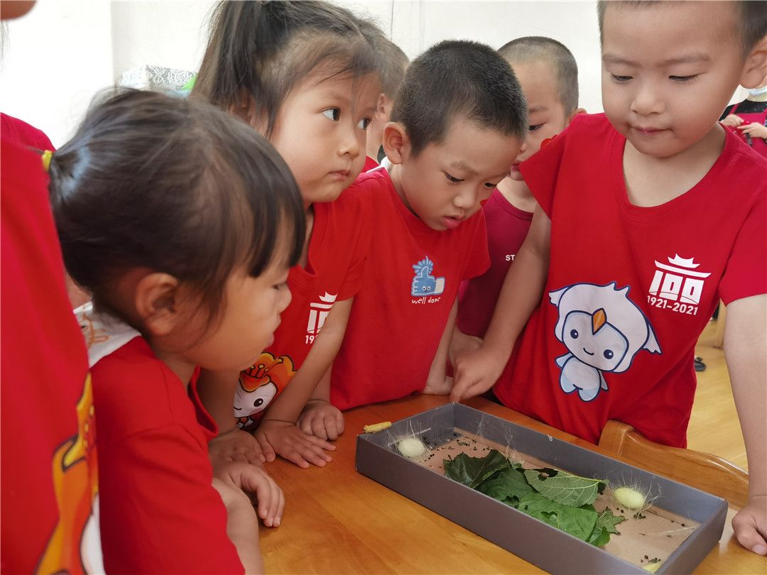 通过调查和分享,萌娃们也学会了一些照顾蚕宝宝的小本领,知道蚕宝宝容易受伤,换桑叶的时候要轻拿轻放。课堂上,孩子们一起学习了绘本《长大很神奇》,知道蚕宝宝要吃很多很多的桑叶才能长大。于是,每天早晨,小七班的萌娃们就带来了爸爸妈妈采摘的新鲜桑叶,想把蚕宝宝喂得饱饱的,期待着蚕宝宝快快长大!