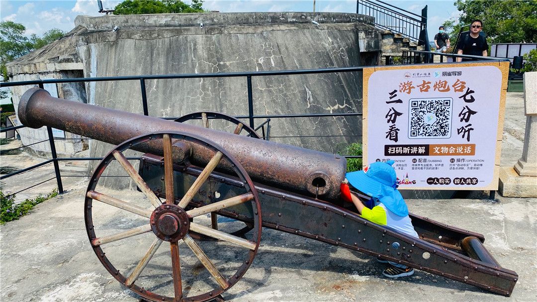 孩子们有序地进到了园区,在导游姐姐的带领下来到了稀世的珍贵文物——克虏伯大炮炮台跟前。通过导游姐姐的介绍,孩子们知道了克虏伯大炮是“现存于原址上最古老最大的19世纪海岸炮”,还进入了上海大世界基尼斯之最名录。克虏伯大炮的炮弹弹壳重约170kg,其主炮位、副炮位子弹库和小火药库连成一体,并和兵营区相连,形成一个完整的进攻体系,它还可以360°旋转射击,无论大炮旋转至哪个方位都可以无阻碍快速精准地运送到位,精准发射。听完解说,孩子们不禁为古人的聪明智慧和精妙的设计点赞!