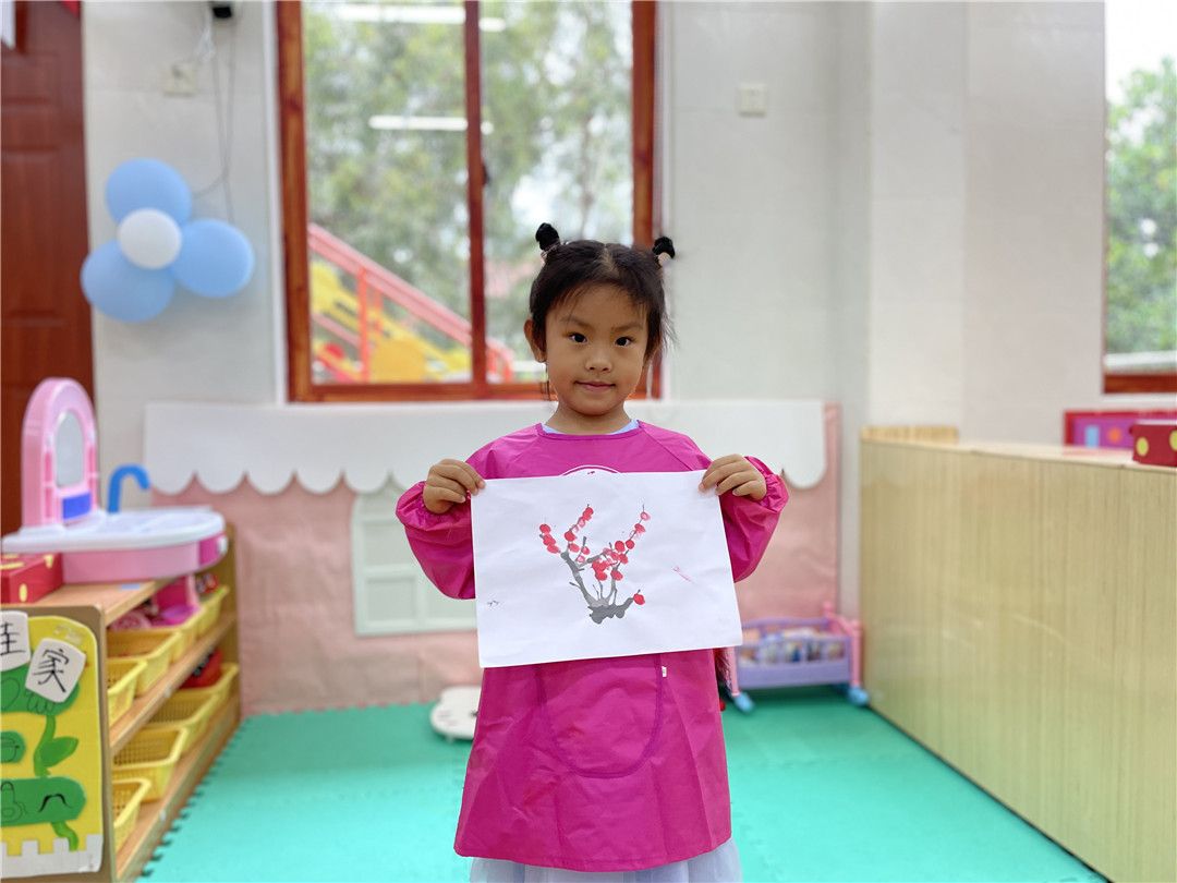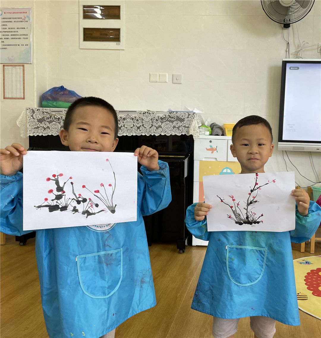 如果想更有意境,在树枝上点上或红或粉的几点颜料,一颗颗美丽的梅树或桃树就映然出现在画纸上……