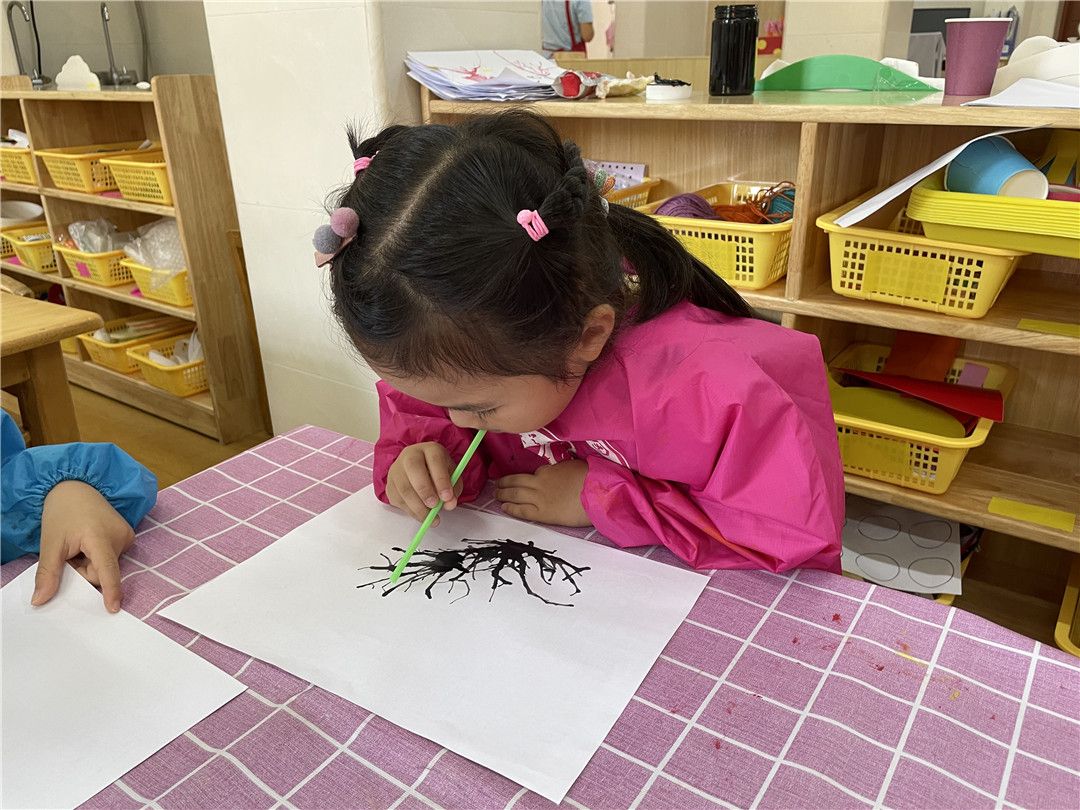 在纸上滴几滴黑墨水,朝着纸的上方用力吹,颜料流动会形成一个个小树枝。多吹几下,一棵大树就出现在纸上啦……