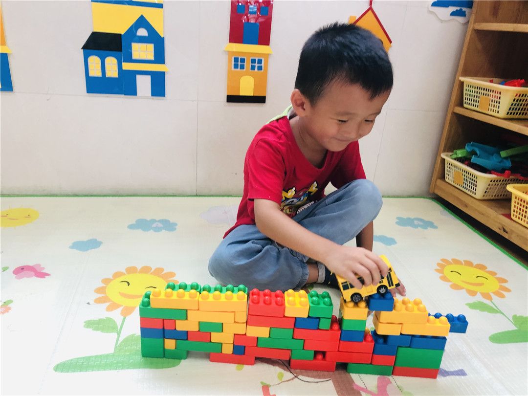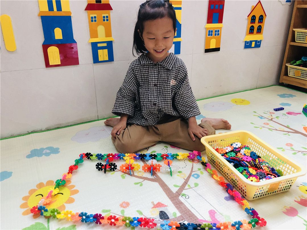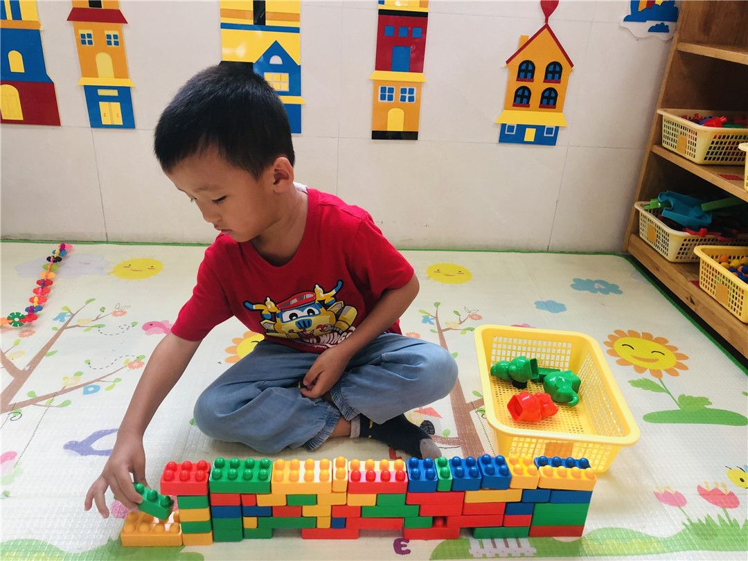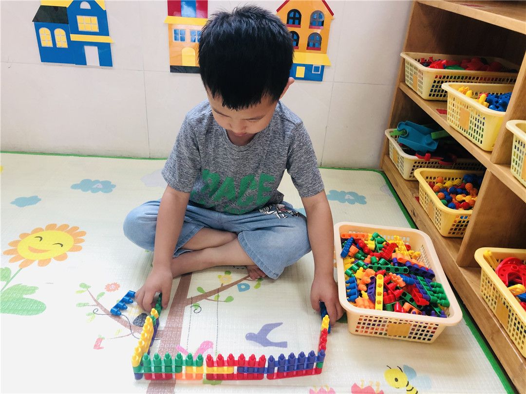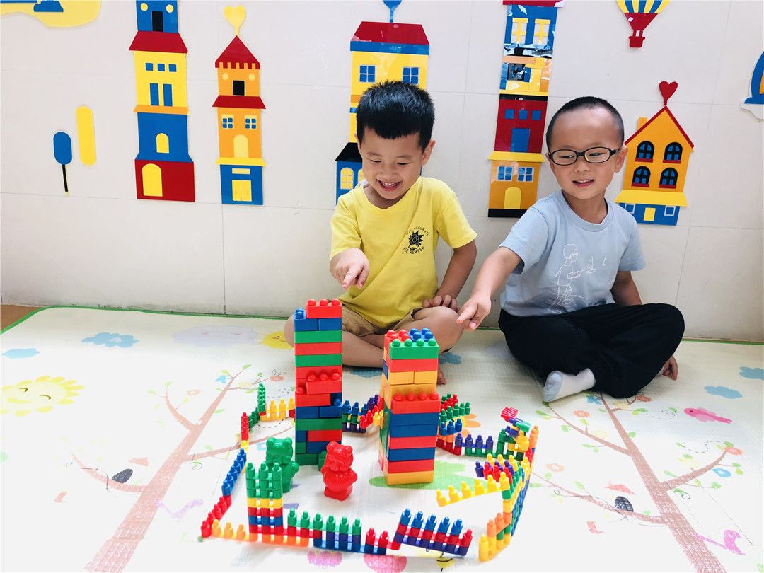 小小建筑师利用彩色的积塑搭建快乐小区,欢迎同伴来家里做客。