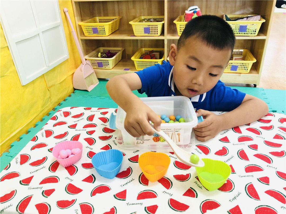 拿起小勺子,找一找,舀一舀,把绿色的小珠子送进绿色托盘的怀抱里。还有蓝色、橙色、粉色小珠子别着急,统统把它舀回家哈~